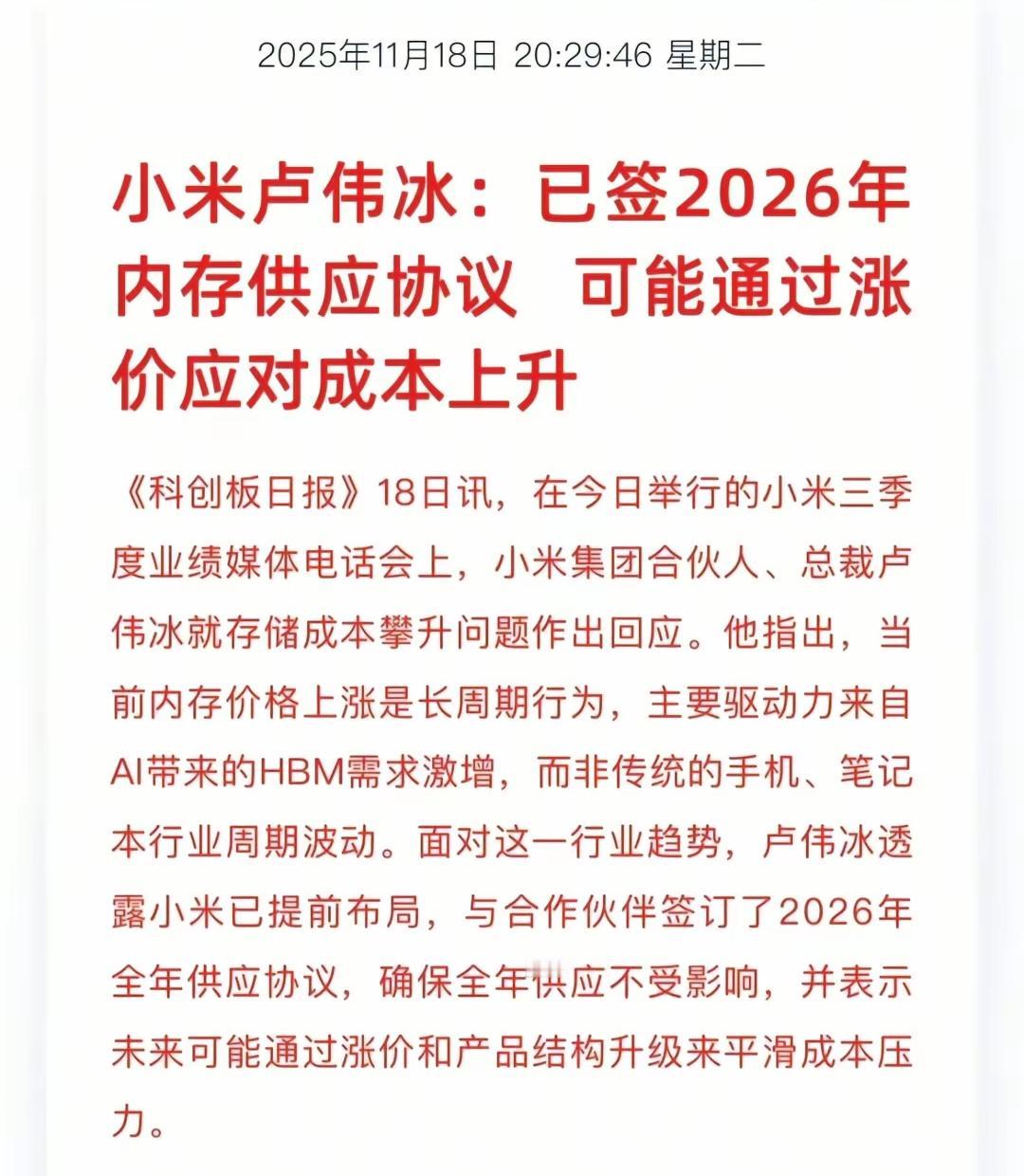 小米卢伟冰:已签2026年内存供应协议,可能通过涨价应对成本上涨! 小米方面认为储存成本上涨是一个长期性的,未来可能通过涨价或者产品结构升级来应对这一波存储成本涨价周期。 对于今年来说,大家都会面临着成本上涨所带来的利润压力,只是各家采用的路线不同。有的企业是放弃了硬件成本盈利的模式,转入了靠手机出货量,通过应用类收费分成提高收益的模式。 各位是怎么看的?欢迎评论区留言。