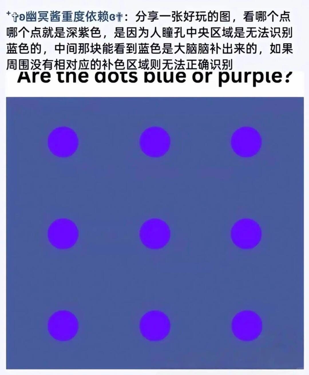 刷到一张视觉图,挺有意思的,来分享给你们,你只盯着一个点看,它是不是变成深紫色了