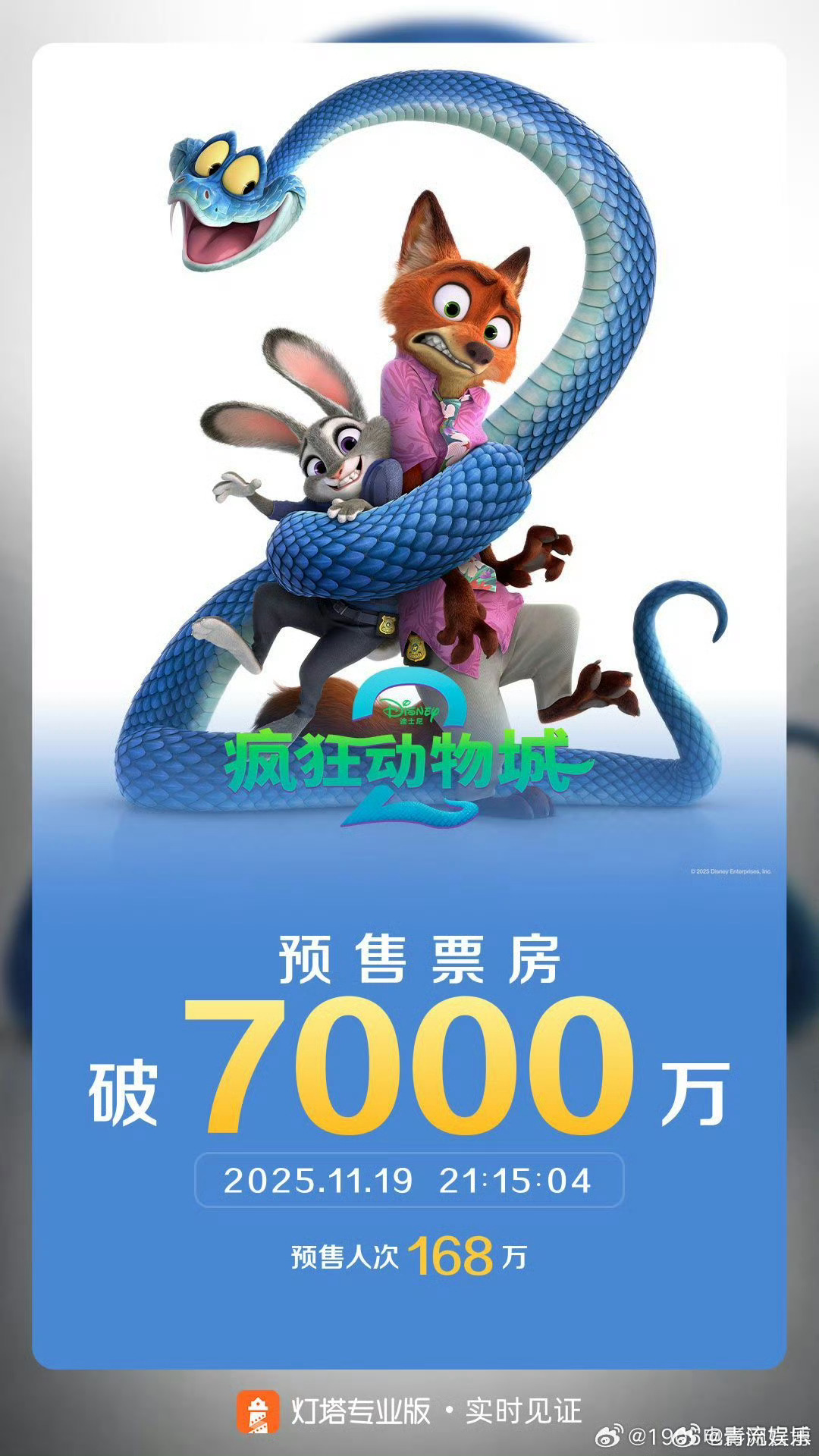 据网络平台实时数据,截至11月19日21时15分,影片《疯狂动物城2》预售总票房突破7000万。