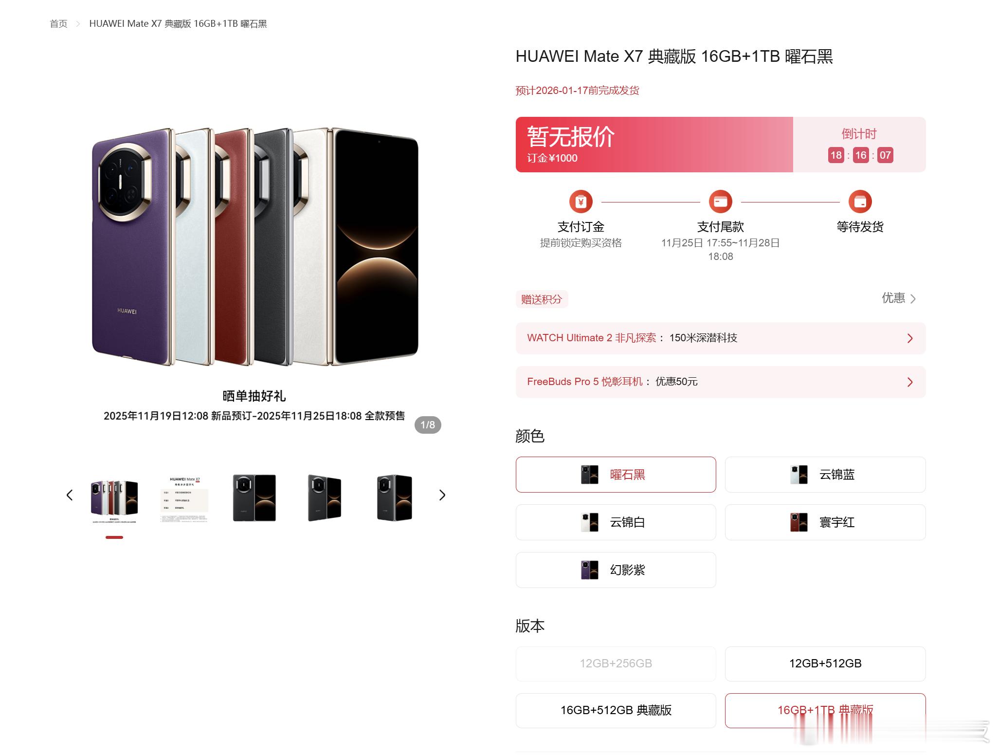 【华为Mate X7折叠屏全系配色曝光】华为Mate X7折叠屏目前已经上架华为官方商城并开启预定,新机提供曜石黑、云锦蓝、云锦白、寰宇红、幻影紫五款配色及12GB+256GB至16GB+1TB四种存储版本。新机升级"超可靠折叠玄武架构",典藏版外屏采用第二代玄武钢化昆仑玻璃,全系支持IP58/59级别防水。搭载麒麟9030芯片与第二代红枫影像系统,后置5000万像素可变光圈主摄+潜望长焦,配备侧边指纹识别。