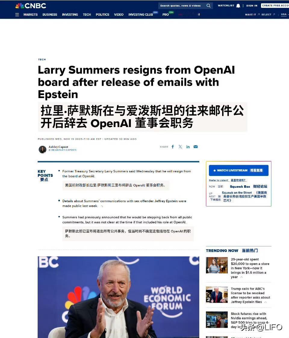 拉里·萨默斯宣布将辞去OpenAI董事会职务,此前他与杰弗里·爱泼斯坦的往来