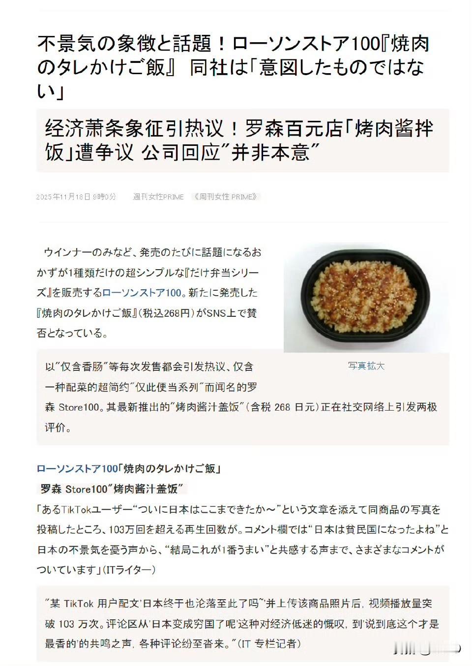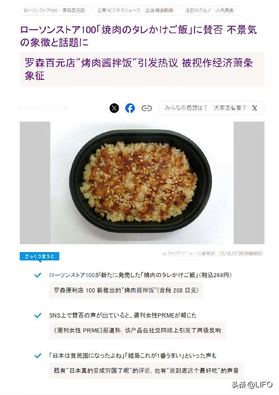 日本社交媒体用户热议一款新推出的便利店餐食——本质上只是米饭淋上些烧肉酱汁,没有肉。部分日本网民将其视为经济疲软的信号,认为日本正逐渐沦为"贫穷国家"。