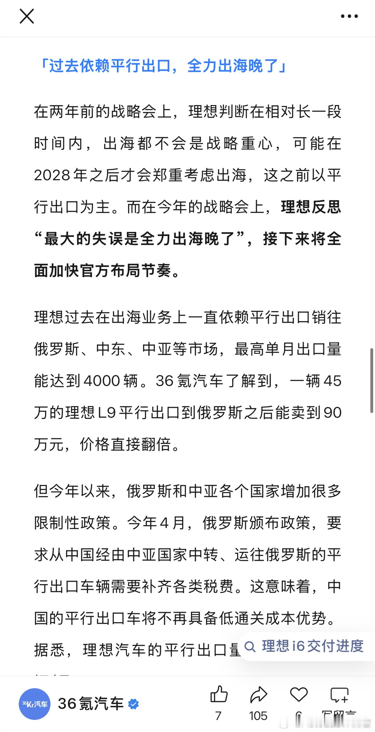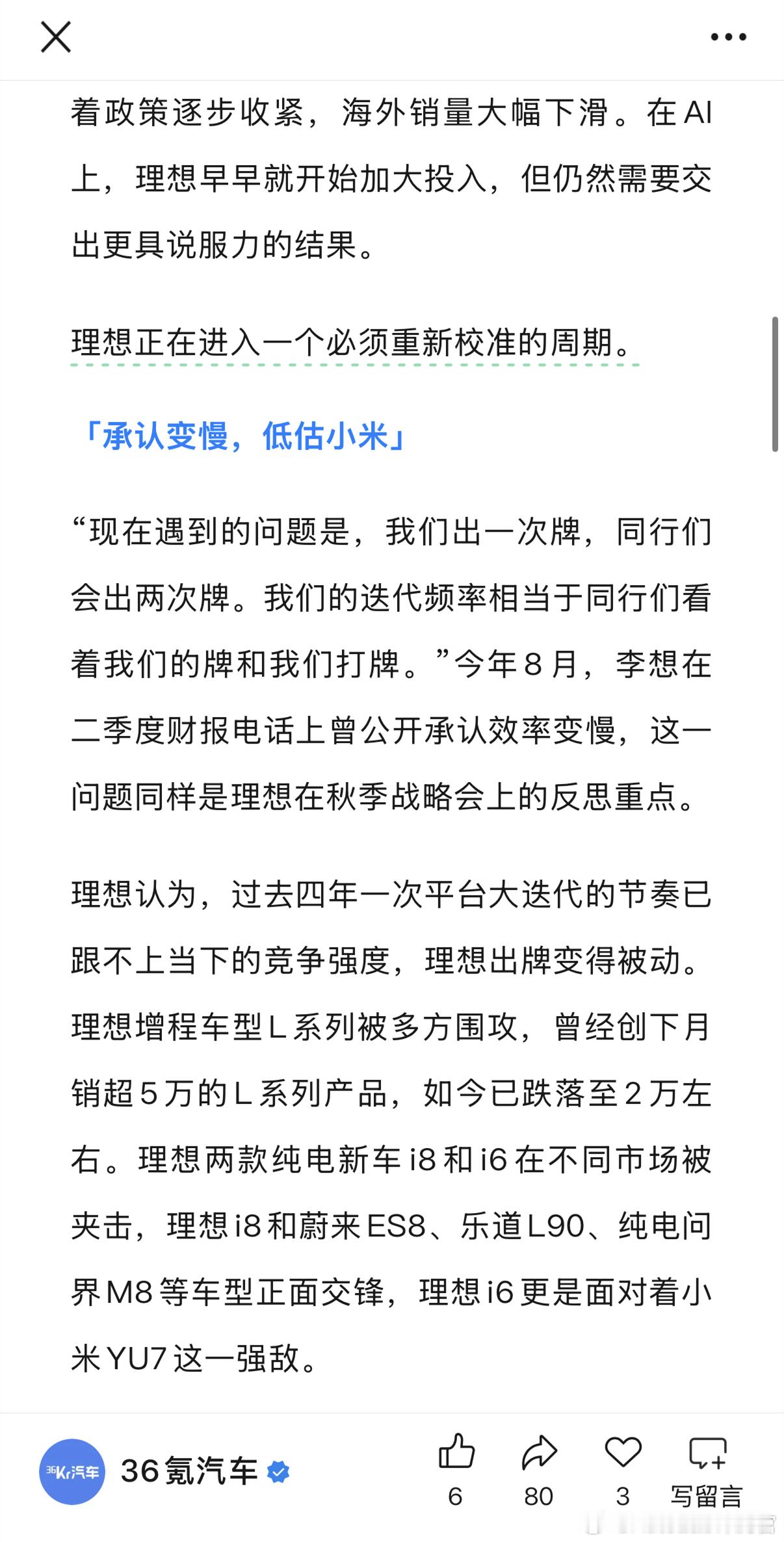 据说李想在前段时间的战略会上,分享了一些反思和心得:1、理想的效率和产品迭代慢于同行,同时还低估了小米YU7这一强敌2、理想过去出海依赖平行进口,接下来将全面加快官方出海的节奏。3、对AI的探索不局限在产品和AI的融合,要对机器人、AI终端应用等方面做大量投入。接下来就看李想会有哪些实际行动,来打破当前理想汽车的僵局了
