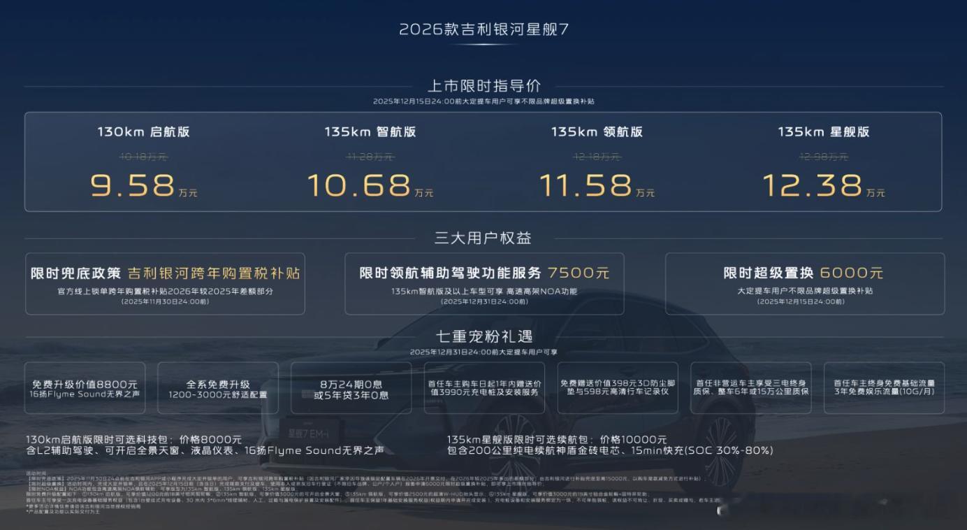 26款吉利银河星舰7 EM-i上市,限时指导价为9.58-12.38万。这次星舰7最重要的升级就是全系纯电续航都在130km以上了。既能让用户日常纯电通勤从从容容,也满足了明年插混车只有纯电续航100km以上才能享受购置税减半的新规。此外,如果想要更长的纯电续航,顶配的135km 星舰版还能选装200km续航包。智能化的升级也是一大亮点。26款星舰7除了照例有Flyme Auto座舱外,还搭载了千里浩瀚H3辅助驾驶方案,支持高速领航、城市通勤领航。另外, 小蓝灯也安排上了,不过入门版就没有千里浩瀚H3和小蓝灯了。大家觉得26款星舰7 EM-i怎么样?