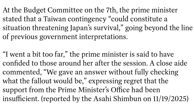 日本《朝日新闻》报道称,首相高市千寻私下告诉身边的人,她关于台湾的言论“有点过火了”。据报道,一位亲信表示:“我们没有充分考虑后果就给出了答案。”