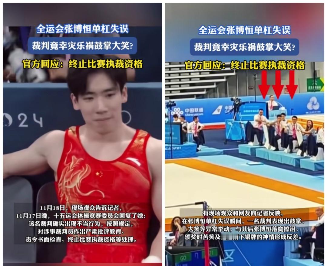 一场比赛, 让人性展现的淋漓尽致 不只是单杠比赛的裁判员,上次举重比赛的教练员也是。 单杠比赛,张博恒失误以后,坐在旁边的教练员,居然又鼓掌又拍大腿,高兴的不像样。 虽然裁判最后被终止资格了,但是看到张博恒失落的表情,很难想象他以后,再次站到赛场上,是个什么心情,还有勇气吗? 还有上次那个举重教练,自己的运动员被杠子压住了,他转头就走,都不上来看一眼。 本来在自己家门口比赛,想想都是一家子人,应该是最放松的吧。没想到自己家里的人,却给自己带来这么大的心理伤害。 这些人究竟咋想的啊?大家能理解吗?