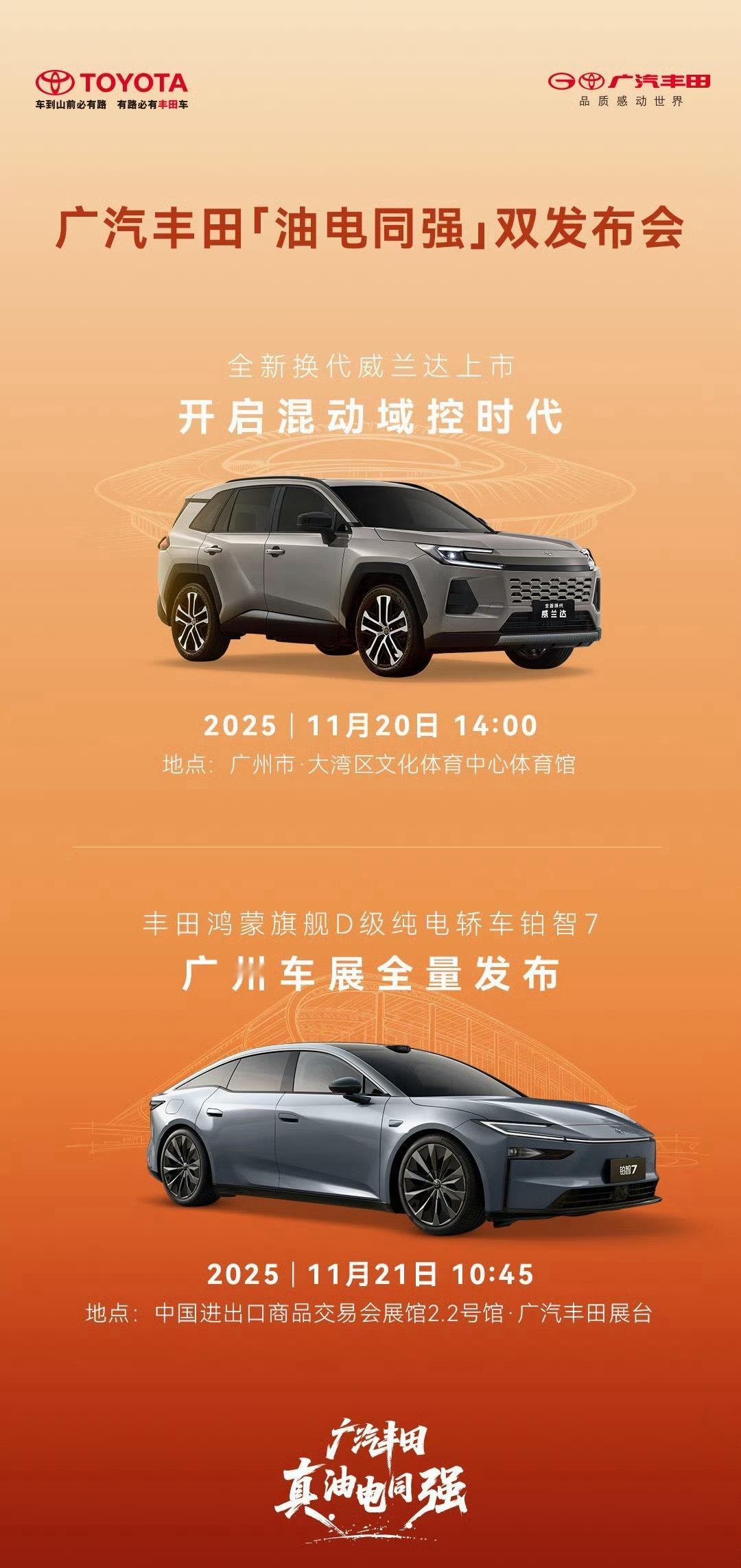 广汽丰田开启双车发布盛宴,油电同强,一边是实力老将全新换代威兰达,另一边是搭载了鸿蒙座舱5.0的纯电新兵铂智7。这两场发布会接连发力,两条腿走路,一边用铂智7冲击纯电市场,靠智能化和长续航抢新用户,一边让威兰达稳住基本盘,挺好