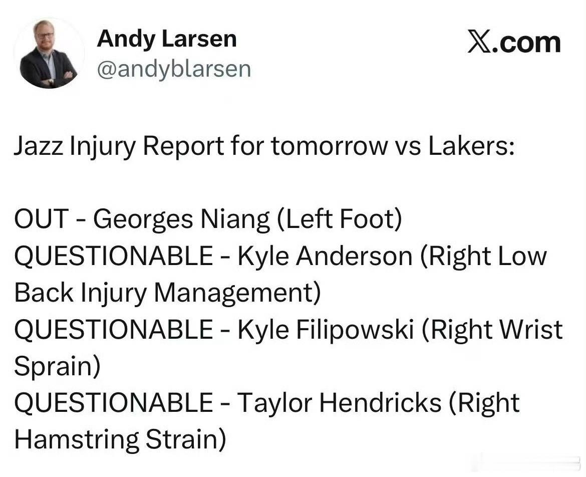 这是我见过湖人本赛季ESPN胜率最高的一次了!居然有88.7%!不可思议,看来ESPN很给老詹面子阿!詹姆斯跟文森特明天都是出战成疑,湖人目前伤病名单就只要他们俩人,但是他们两人目前都是出战成疑,也就是说明天湖人有可能迎来完整体!太好了!詹姆斯明天有可能复出,目前湖人官方还未给出首发名单,湖人詹姆斯跟湖人全队今天都在积极备战明天对战爵士的比赛!爵士明天伤病报告:尼昂(左脚伤势)已经确认缺席!李凯尔(右腰伤势管理)菲利波夫斯基(右手腕扭伤)亨德里克斯(右腘绳肌拉伤) 这三个人都是出战成疑!爵士主要是靠马尔卡宁在输出,他本赛季排在得分榜第6位,火力非常猛,最近三场比赛,他分别砍下35分,40分,47分!但是他要面对的是东契奇以及里弗斯这两位火力点,如果詹姆斯明天复出,那他将要面对三个火力点,所以他肯定是招架不住的,湖人明天稳稳拿下胜利!希望明天湖人首发名单能看到老詹的名字!