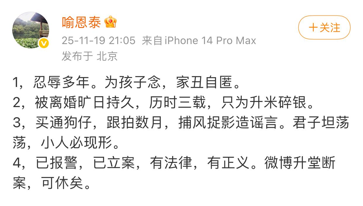 没想到时隔五年半喻恩泰再次更新了一条微博,就是因为近期的婚变风波! 不过这事到底该信谁的?我信秀才更多一点,因为这事从一开始就感觉是循序渐进的,先是来个模棱两可的爆料,让大家去猜,之后直接爆是秀才,可能觉得热度不高,就带着其他明星夫妻继续炒,接着秀才这边朋友和女方出轨对象的老婆爆料的证据什么的都没什么热度,很难被看见…..所以信秀才更多一点!大家觉得呢?