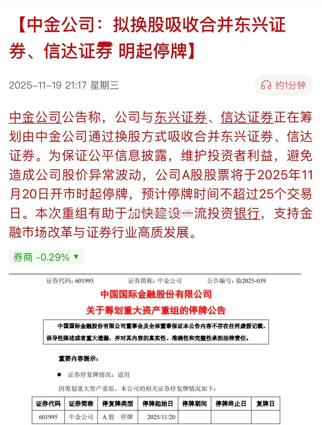 中金公司:拟换股吸收合并东兴证券、信达证券, 明起停牌…重组潮又来一波?