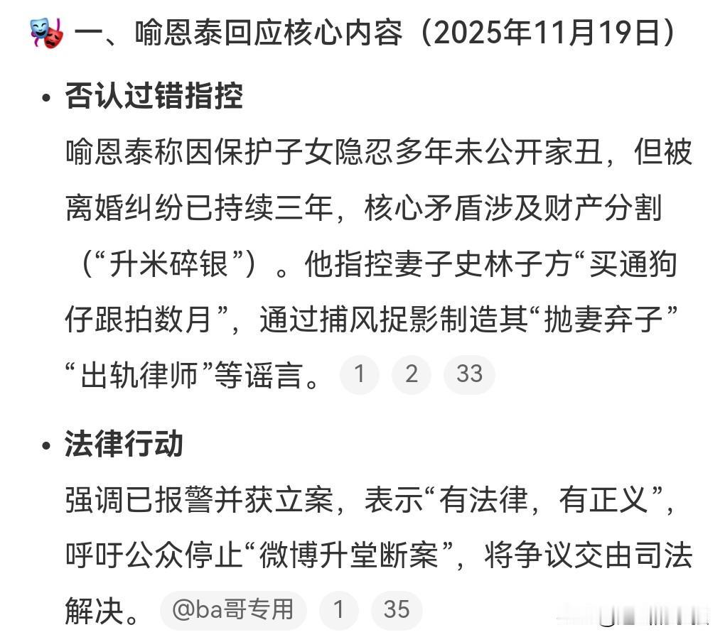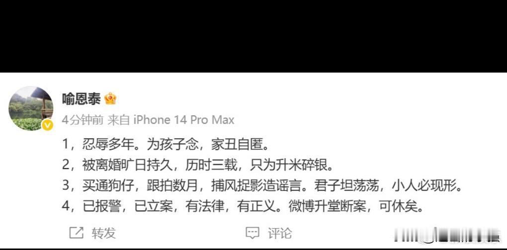 喻恩泰不愧是文化人,他回应了最近有关于他出轨的传闻。 用文绉绉的形式来回应的,用了很多的成语和文言文来回应。 他否认了关于他的出轨传闻。 并说已报警已立案。 那我们也希望这个事情能真相大白于天下,看到底是谁对谁错。 如果有人涉及触犯法律,那就法律惩治。