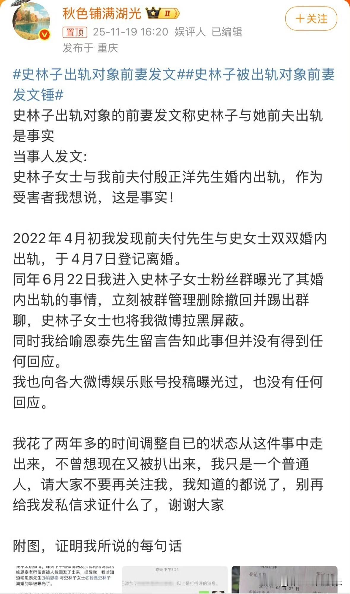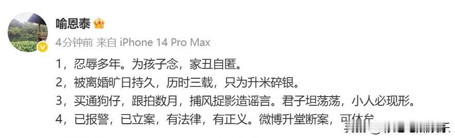 家丑不可外扬,喻恩泰的形象已经不可挽回了,他否认出轨说已经报警,现在是公说公有理,婆说婆有理。 史林子出轨男人的前妻发文证实,史林子就是出轨了她前夫,人证物证均在,喻恩泰才下决心离婚。 史林子出轨已经是不争的事实了,她还想拉喻恩泰下水,想让他身败名裂,一起臭名远扬。 其实公众人物离婚,对名气大的最不利了,喻恩泰这次要赌上事业与她火拼,能体面协商解决的事,用不着大动干戈。