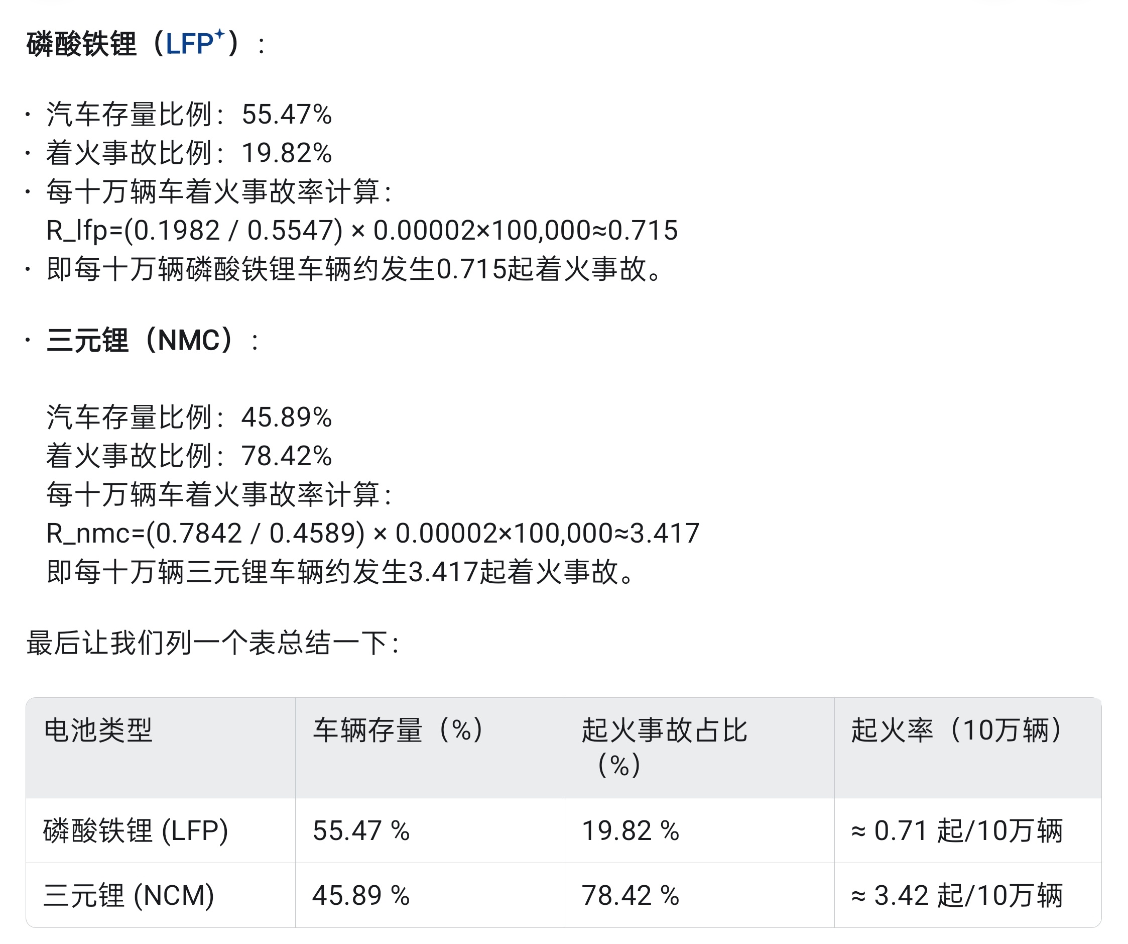 最近网上老刷到有人说三元锂电池有多危险,搞得我像是车里放了个火药桶似的,天天开车提心吊胆。这真有那么危险吗?刚好刷到了知乎一个回答,有个人估算了一下电动车的起火事故率,每十万辆车,搭载磷酸铁锂电池起火0.71起,搭载三元锂电池起火是3.42起。咱先暂且不说三元锂平均车龄更久,以及早年的锂电池技术不成熟等等因素,姑且当这个数是合理的,那就是说,三元锂电池起火的几率是3.42/100000。这个几率是什么概念呢?这么说吧,之前我参加北京油车摇号,中签率大概是0.5%。我特么要连中两次签,才和三元锂电池起火的几率差不多,这几率也太低了吧!!如果仅仅是为了降低这么一丢丢的起火概率,而去选择磷酸铁锂电池,我实在是理解不了。增加的重量会牺牲各种动态性能,动力、刹车、操控、能耗以及冬季续航等待性能都要打折扣。就算是磷酸铁锂真的安全了那么十万分之几,那从代价上也划不来呀!按这个数来算下来,渲染三元锂电池危险性的纯属灌输焦虑,根本没有必要为小概率事件付出那么大代价
