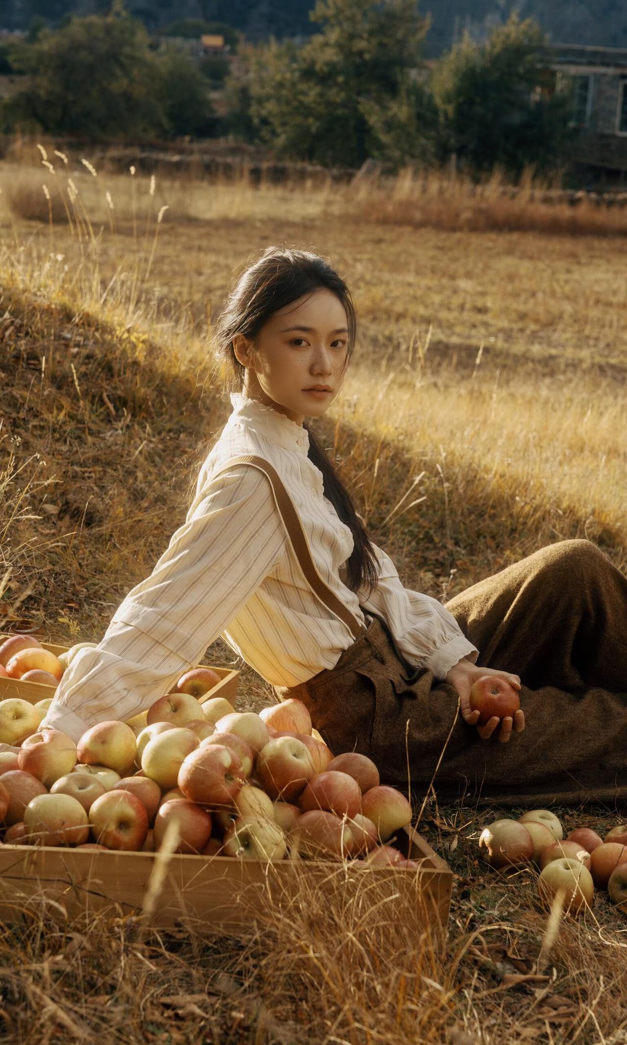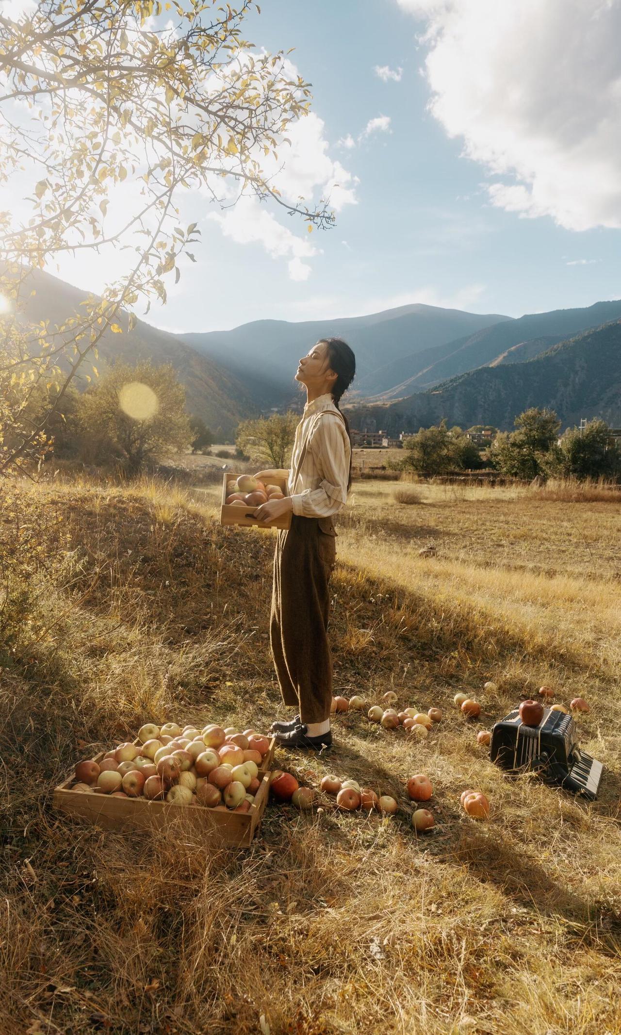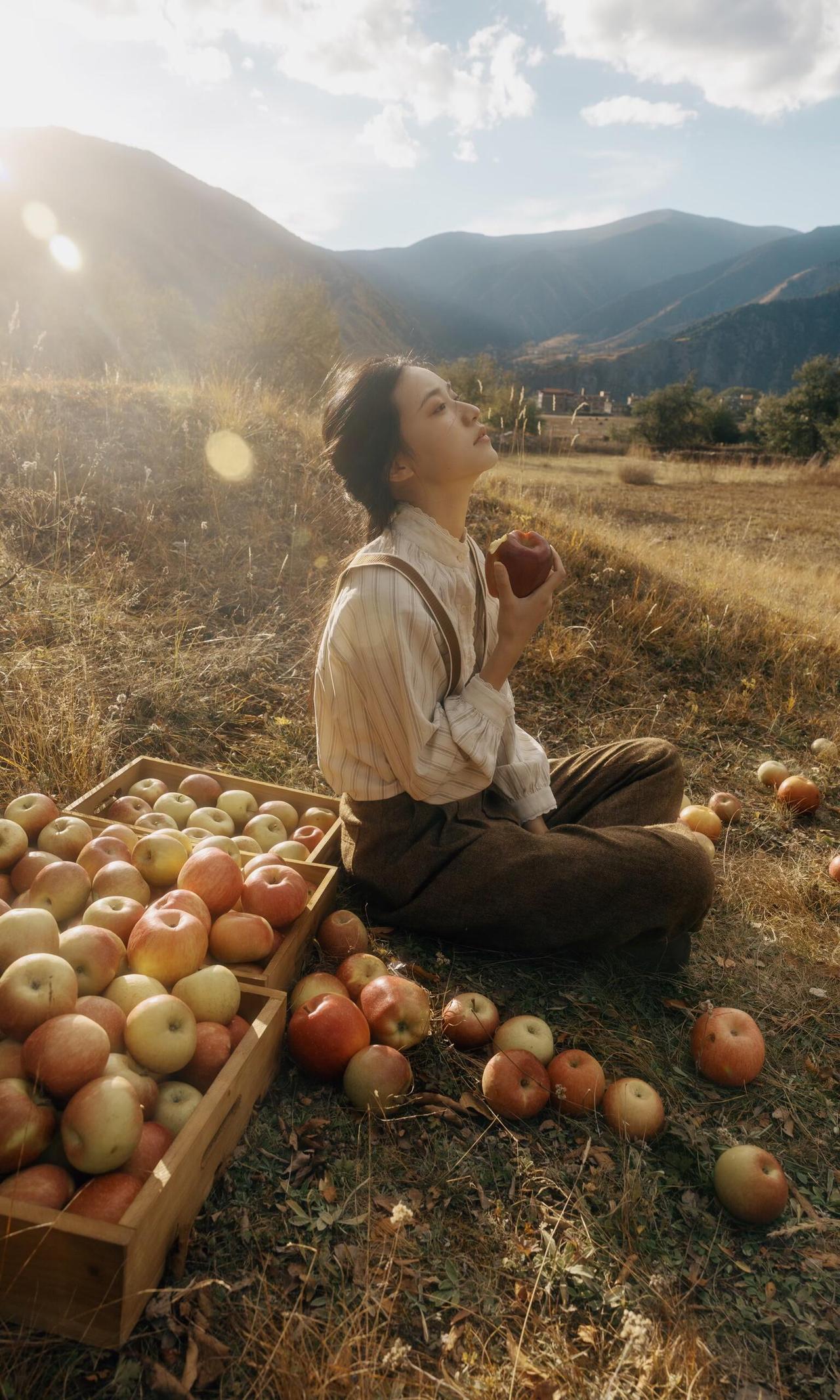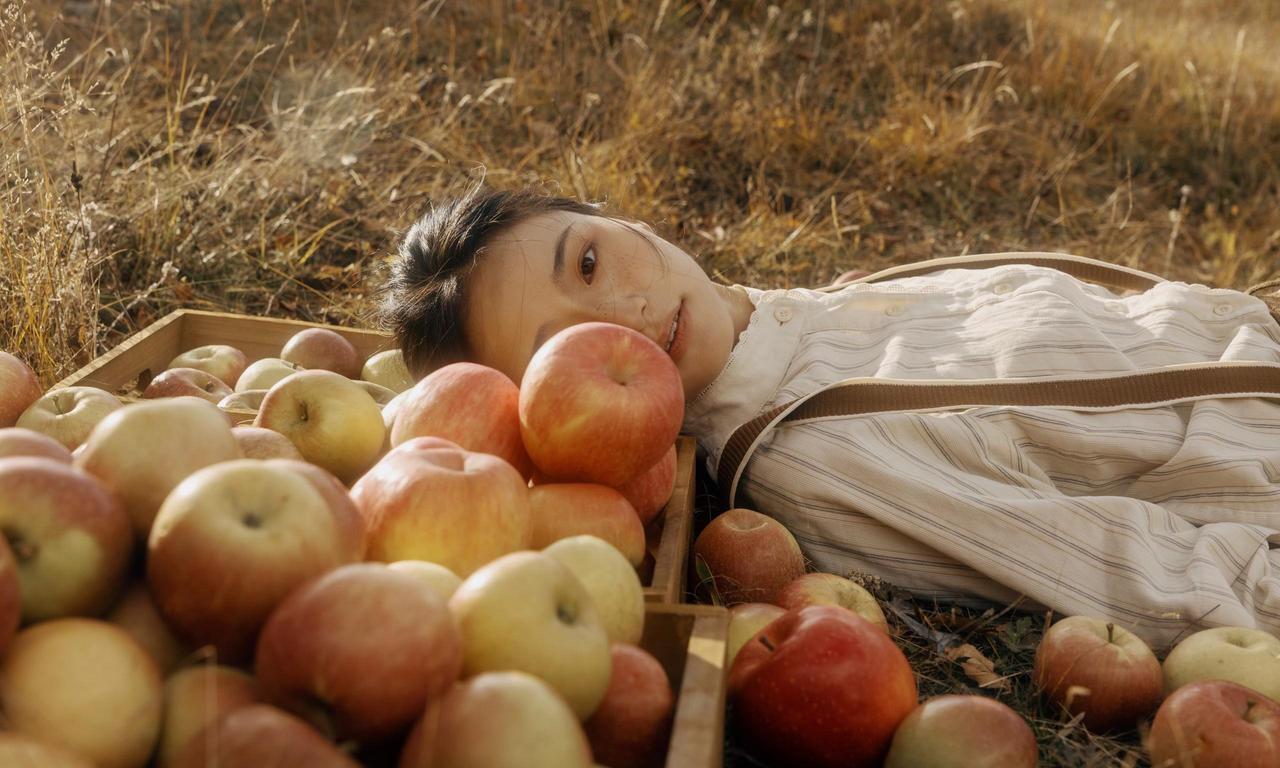 构图上的巧思最见用心:人物或半埋在果箱后,或与散落的苹果形成“包围式”互动,打破了常规人像的“主体突出”逻辑,转而让人物成为自然场景的一部分。比如果箱斜压在肩头的画面,果实的饱满与人物的舒展形成视觉张力,既没让道具抢去重心,又借由“被果实包裹”的姿态,传递出与山野共生的松弛感。