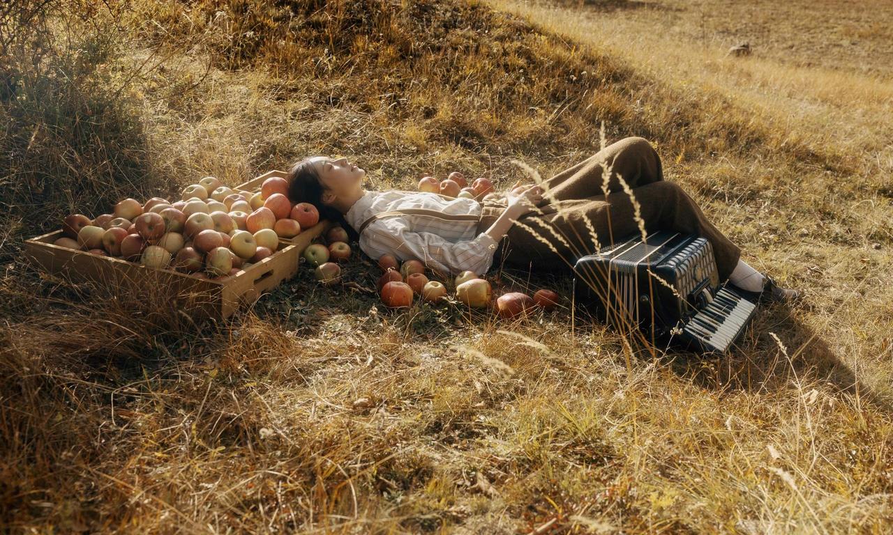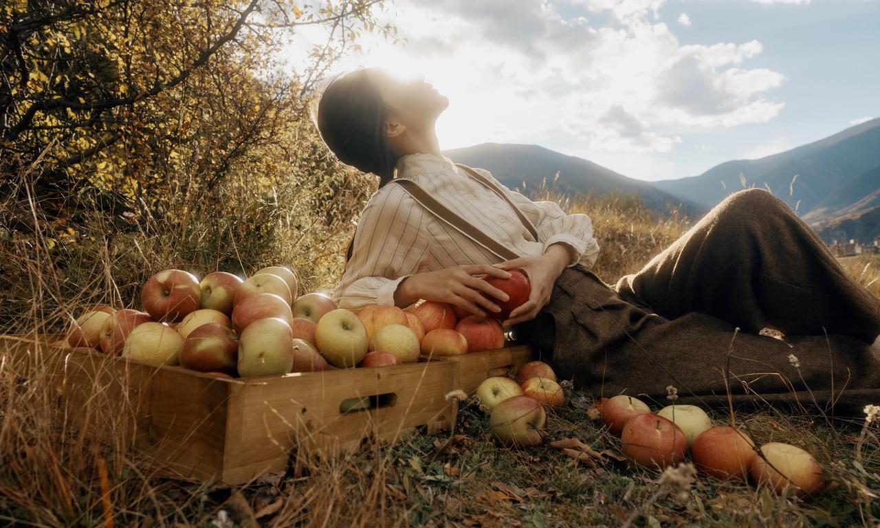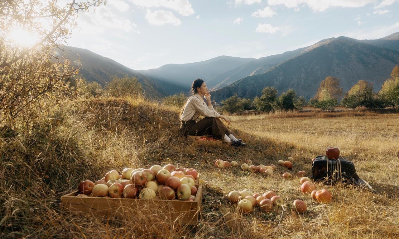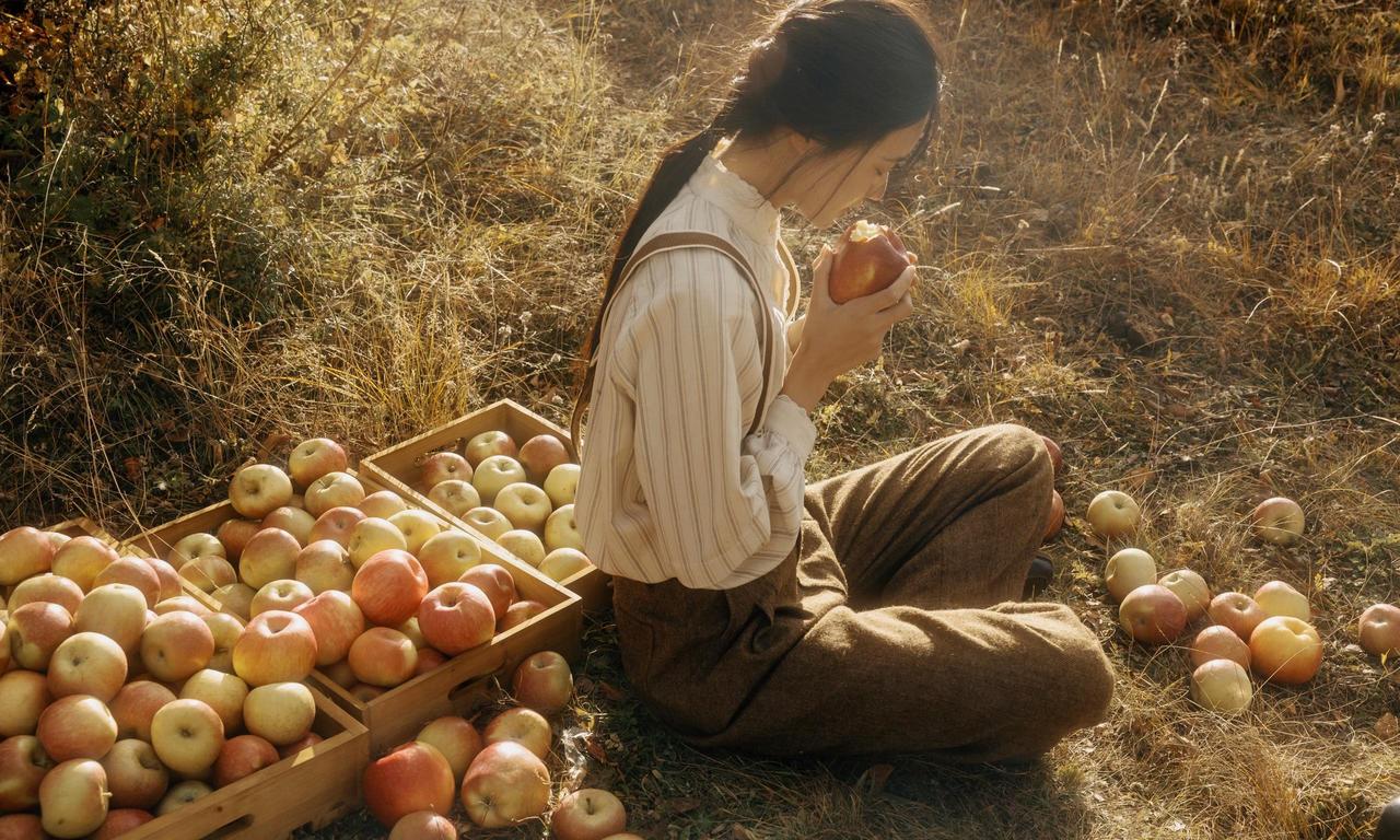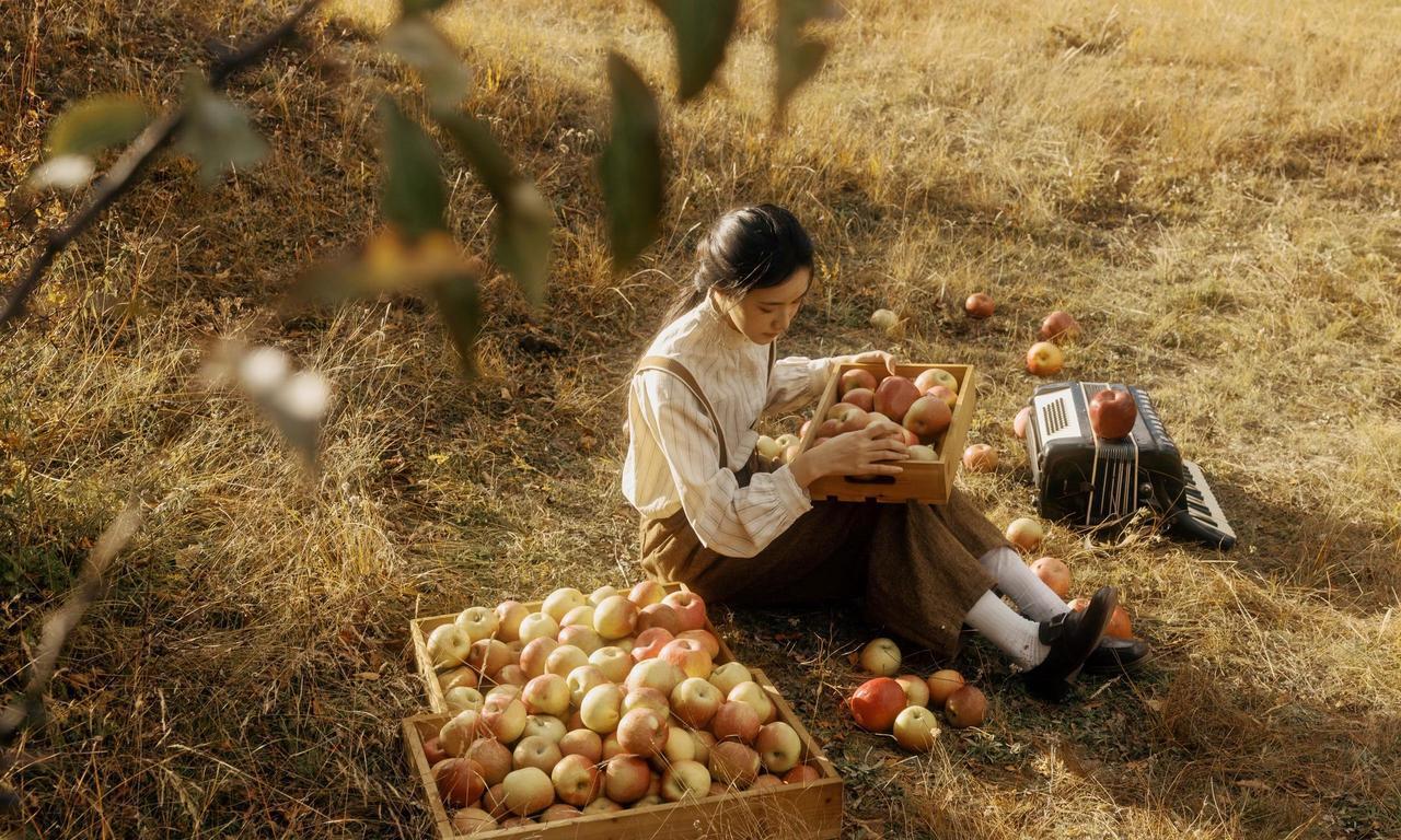 构图上的巧思最见用心:人物或半埋在果箱后,或与散落的苹果形成“包围式”互动,打破了常规人像的“主体突出”逻辑,转而让人物成为自然场景的一部分。比如果箱斜压在肩头的画面,果实的饱满与人物的舒展形成视觉张力,既没让道具抢去重心,又借由“被果实包裹”的姿态,传递出与山野共生的松弛感。