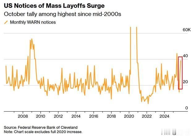 美国大规模裁员预警正以令美国人担忧的速度上升:10 月份有 39,006 名美国人收到了提前裁员通知,这是自 2020 年 covid 以来的第二高数字。这些通知是根据《美国工人调整与再培训通知法案》(WARN)发布的,该法案要求受约束的雇主在大规模裁员或工厂关闭前至少提前 60 天发出通知。自 8 月份以来,这一数字激增了 162%,当时有 14,900 名美国人收到了此类通知。自 2006 年以来,美国员工调整与再培训通知(WARN)数量仅在 2008 年、2009 年、2020 年及 2025 年 5 月达到更高水平。这使得 12 个月平均值升至 26,927 宗,与 2008 年的水平相当。更大规模的美国裁员浪潮即将到来。