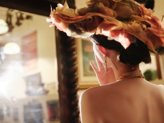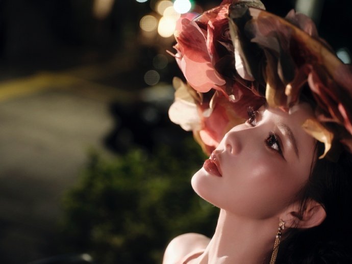 工作室公开今日活动造型,繁花围绕,层层堆叠的立体花朵铺满裙摆,与帽子相呼应,好似