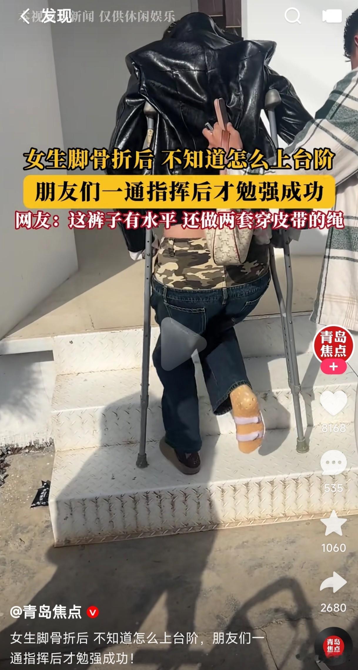 从来没有拄过拐杖的人是不是不知道怎么上台阶? 女子脚骨折后,拄着双拐不知道怎么上