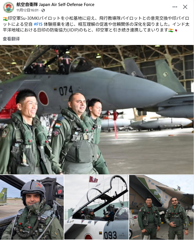 印度苏-30MKI飞行员乘坐日本航空自卫队假想敌部队"飞行教导队"的F-15J战斗机,航空自卫队表示将继续在日印印防务合作(JIDIP)框架下与印度空军开展合作