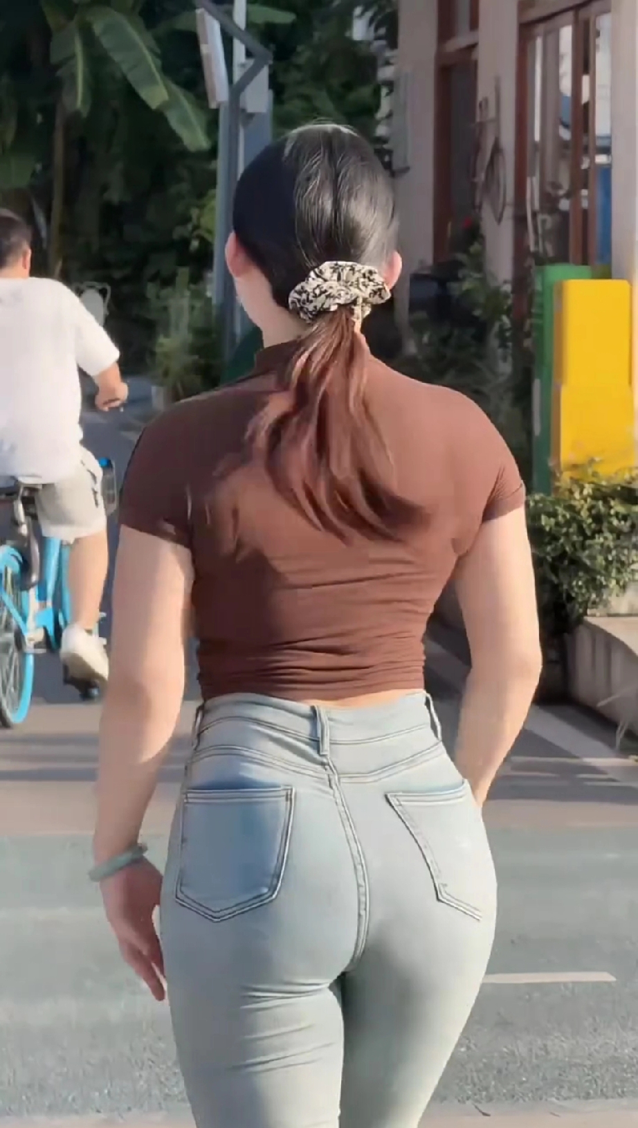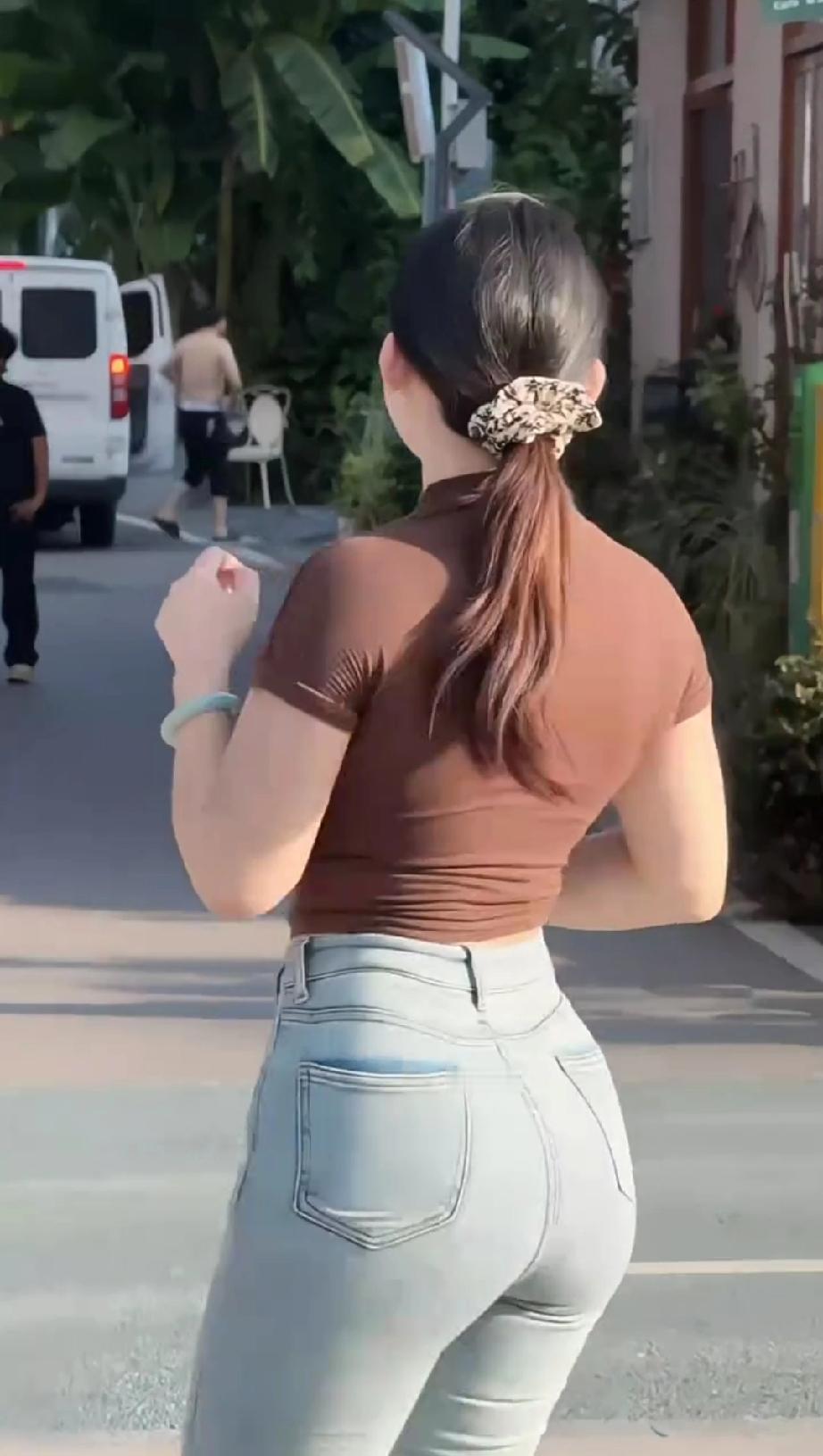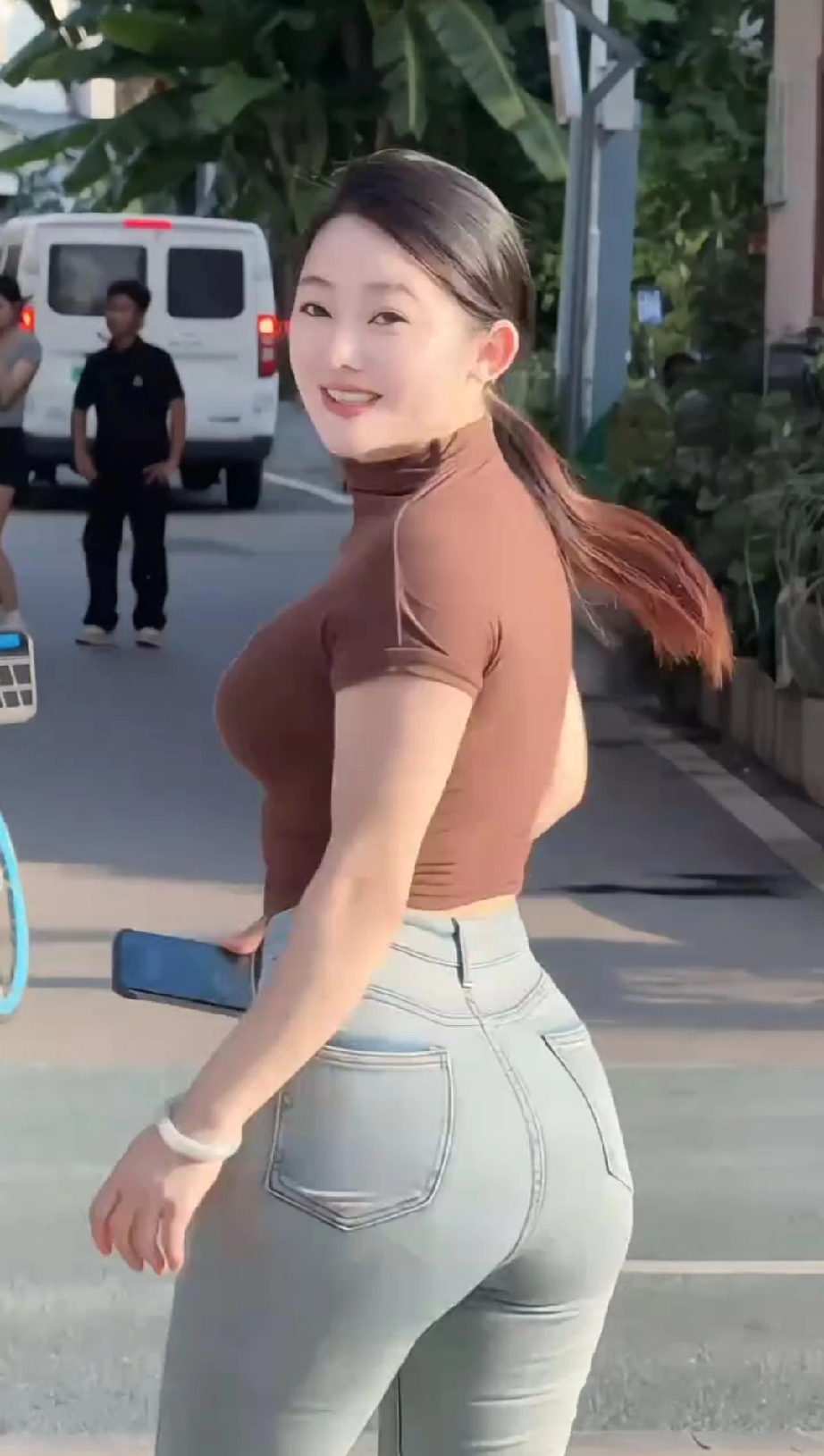 街拍久了见过太多的美女素人了,有身材好的,有长相漂亮的,性感的等等,但是还是被这位美女惊艳到了,棕色的上衣加一条简单牛仔裤,身材完美而健康,最为令人难忘的是她的笑容,自信阳光还带一点调皮,给人一种如沐春风的感觉,相信谁如果有幸能够跟她在一起生活,日子一定是不会枯燥无味,而是充满乐趣的。