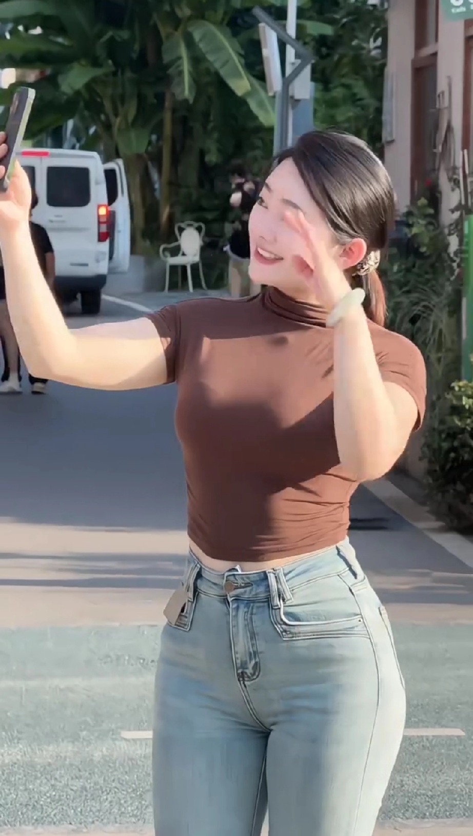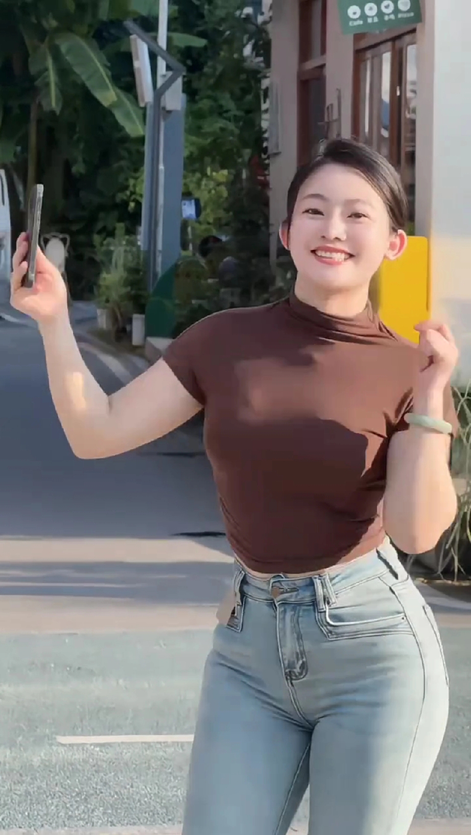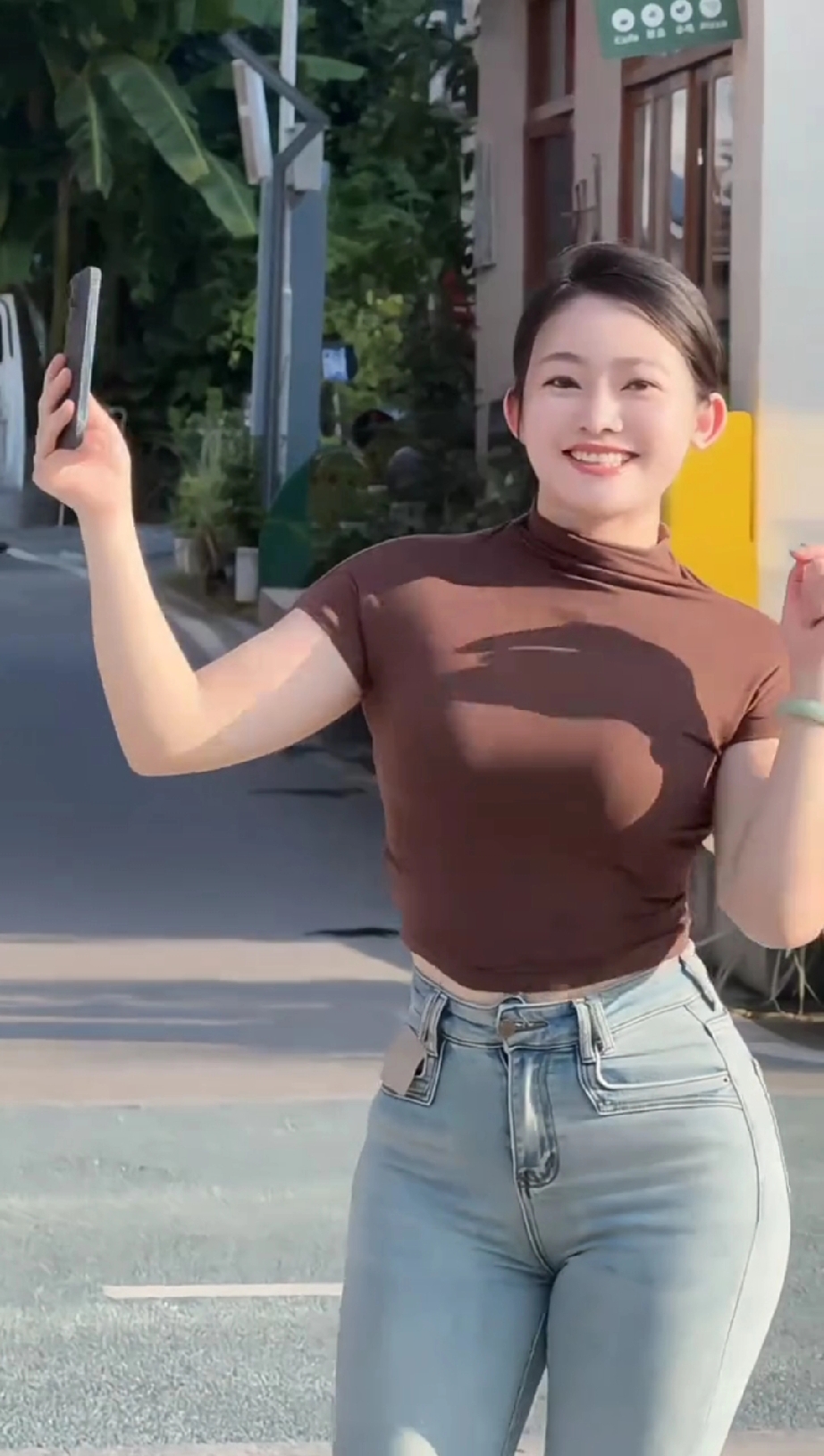 街拍久了见过太多的美女素人了,有身材好的,有长相漂亮的,性感的等等,但是还是被这位美女惊艳到了,棕色的上衣加一条简单牛仔裤,身材完美而健康,最为令人难忘的是她的笑容,自信阳光还带一点调皮,给人一种如沐春风的感觉,相信谁如果有幸能够跟她在一起生活,日子一定是不会枯燥无味,而是充满乐趣的。