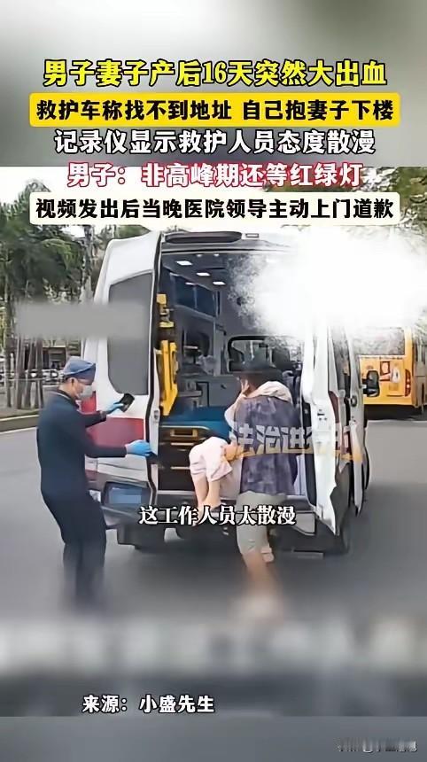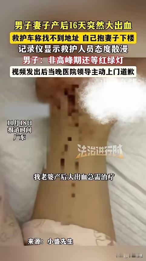 “严查到底!”近日,广东深圳,一女子产后16天在家大出血,丈夫急叫救护车,对方却称找不到地址,丈夫只能抱妻子到小区门口等,赶来的护士还态度散漫。网友怒批:拿生命当儿戏。 11月18日,小盛妻子突发产后大出血,他紧急拨打急救电话,反复报地址,可救护车迟迟不到,还以“找不到地址”为由拖延。妻子脸色苍白、冷汗直流,小盛咬牙把她从楼上抱到小区门口,每一步都像在和时间赛跑。 救护车到了后,护士慢悠悠走来,站在一旁不急救。更可气的是,非高峰期救护车还等红绿灯。小盛急喊“我老婆快不行了”,对方却毫无反应。 小盛把记录仪视频曝光,救护人员散漫态度引网友暴怒。有人质问“急救通道成摆设?”,有人痛批“这是草菅人命”。 急救延误并非个例。此前某地心梗患者因救护车拖沓错过最佳抢救时间。急救本是生命通道,如今却屡屡掉链子,到底是管理问题还是人员责任心缺失? 幸好小盛妻子经治疗已脱险。视频发出当晚,医院领导上门道歉,承诺严肃处理。但道歉能换回信任吗?急救机构若不整顿,谁还敢把生命托付给“慢动作”救护车? 急救是生死竞速,每一秒都关乎生命。希望这次事件能让急救行业警醒,加强管理、强化责任心,别让“生命通道”变成“生命陷阱”。 各位读者你们怎么看?欢迎在评论区讨论。