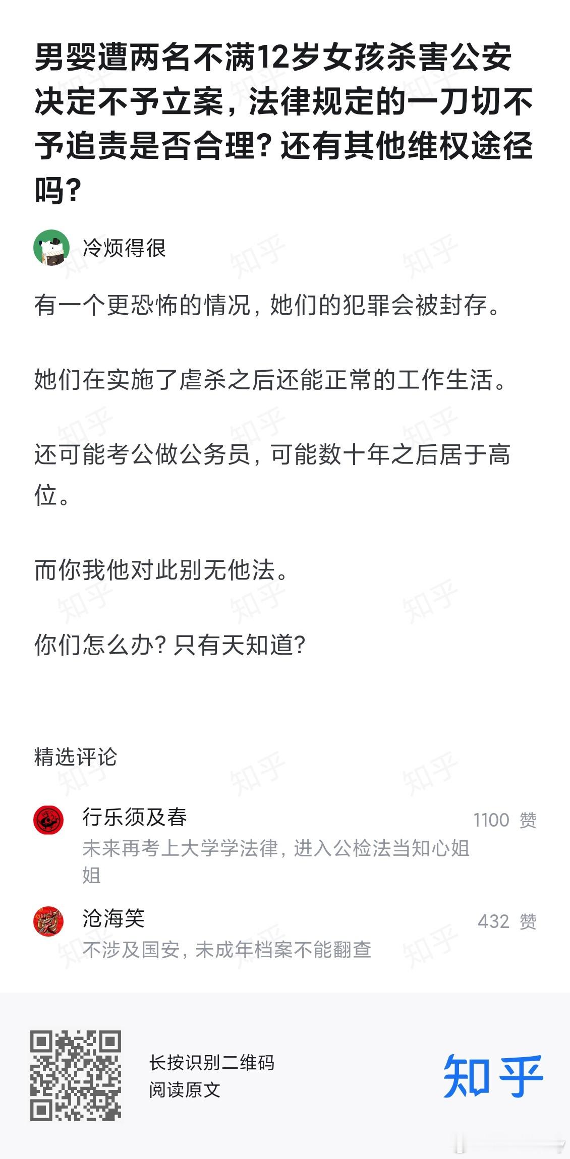先不讨论刑事责任年龄了,也不说什么恶意年龄补足了。不予立案,不追究刑事责任,根本就谈不上封存不封存如果她们有一天走上了公检法的岗位……