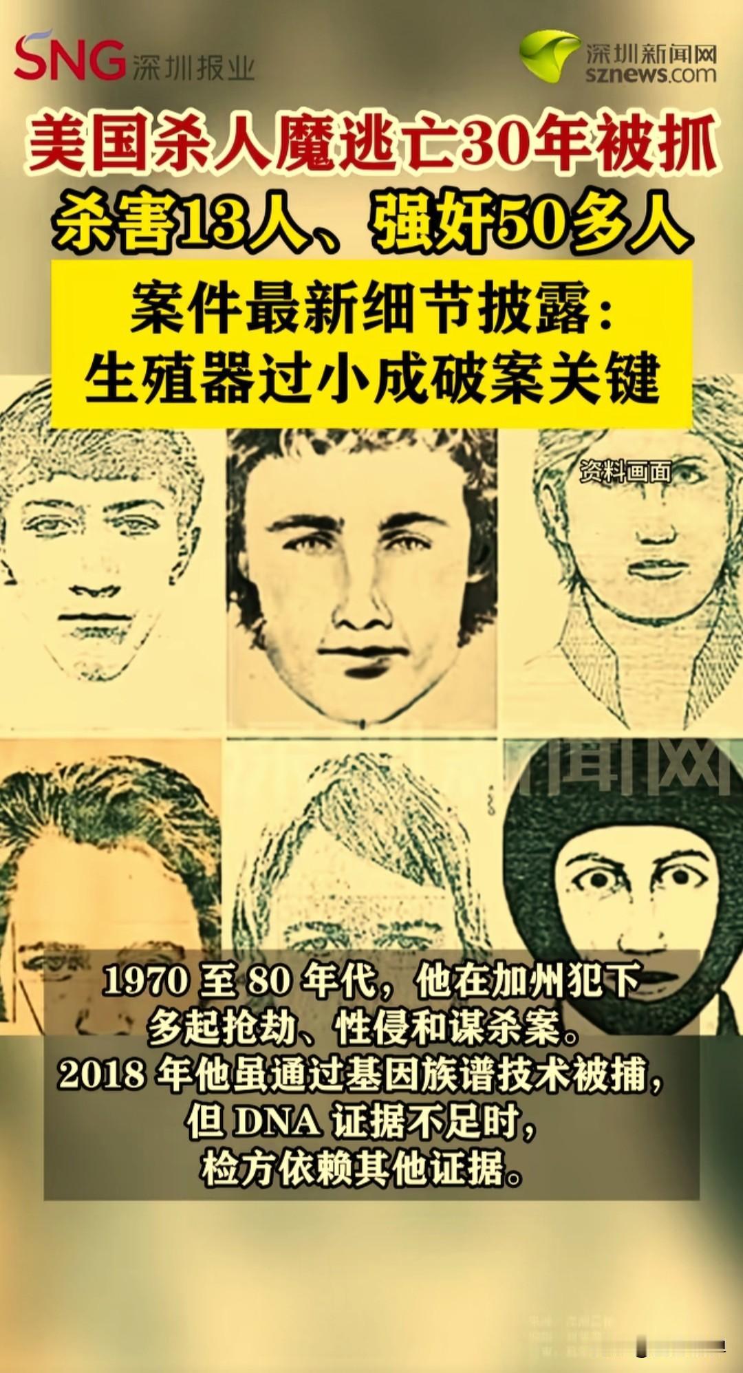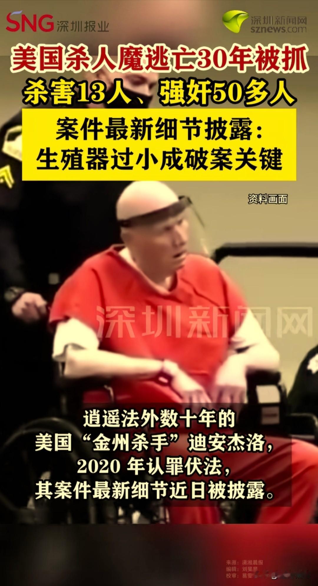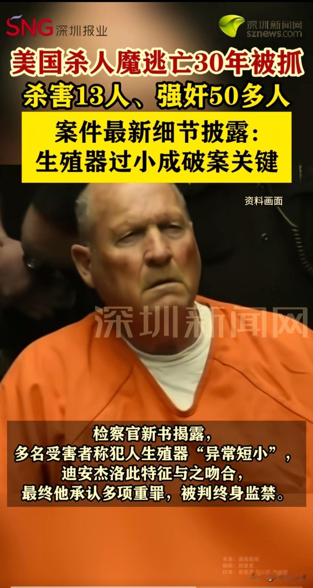 近期美国加州萨克拉门托县地方检察官发布的新书内容,披露了一个案件,号称“金州杀手”的杀人恶魔逃亡30年被抓,生殖器过小成为破案关键。 这名叫约瑟夫·詹姆斯·迪安杰洛的恶魔,在1970年到1980年,在美国加州犯下了至少12起谋杀、超过45起性侵以及数百起入室抢劫案。 多名受害者都不约而同的描述这名罪犯拥有一个“异常短小”的生殖器,这种高度一致的描述,引起了检察官蒂恩·霍的注意,他经过一连串的证据,他认为需要确认这个罪犯他的生殖器确实极端短小。 迪安杰洛被拘留后,警方安排了一名摄像师对他的生殖器拍照取证,现场警官描述说:“它的周长比一角硬币还小,长度相当于你的小指尖”。 取证过程一度也因为其尺寸过于微小而遇到困难,但这些官方记录和多名受害者的描述完全吻合,为后面多起案件并案处理提供了有力的佐证。 2018年被抓获,2020年认罪伏法,为避免死刑,他承认了包括13起谋杀案和一系列强奸、抢劫在内的共26项重罪,最终被判处多个连续无期徒刑,且不得假释。