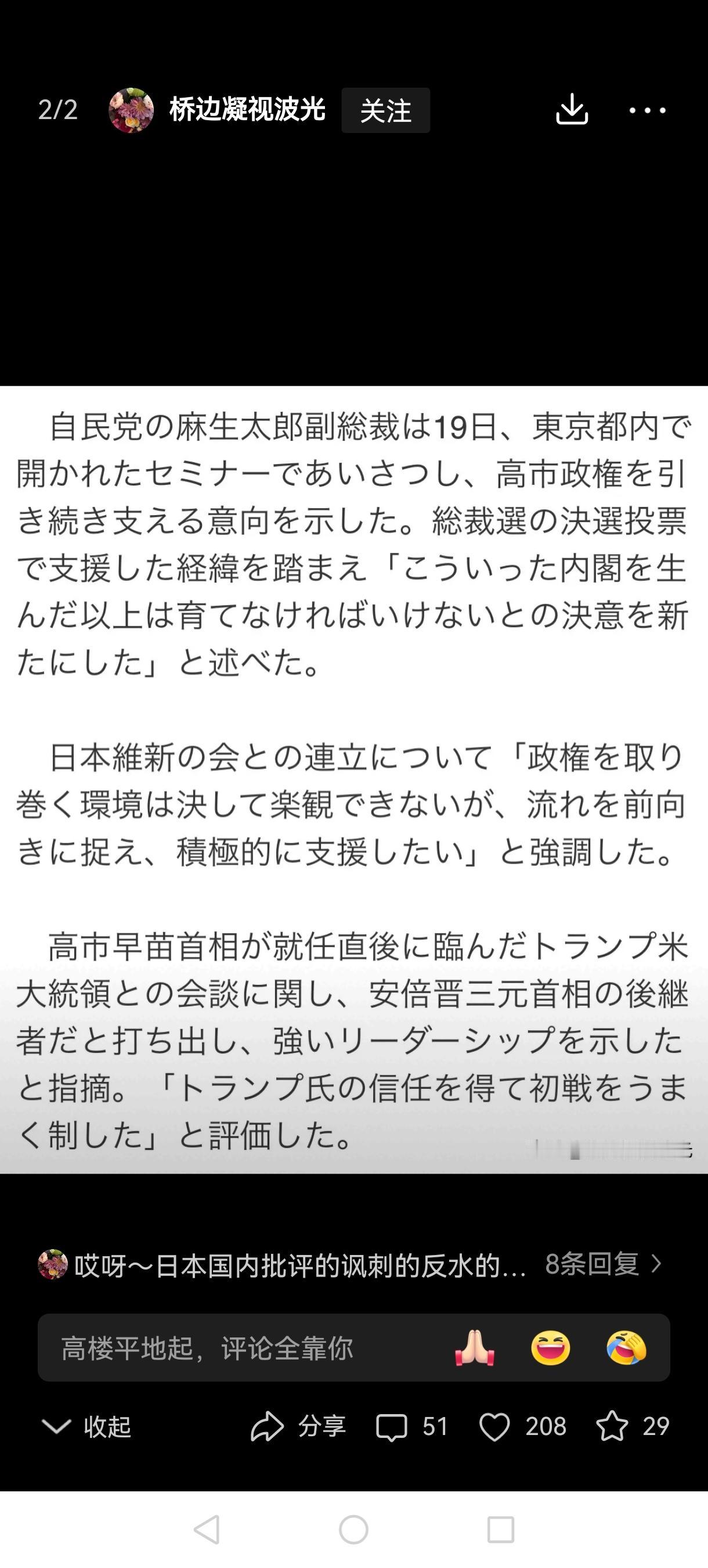 麻生太郎出来给高市早苗撑腰了 实锤!他才是操控一切的幕后黑手。 麻生太郎在19日的东京一场研讨会上明确表示,会继续支持高市早苗的政权,他提到“既然让这样的内阁诞生了,就必须把它好好培育下去”,延续了之前在总裁选举决选投票里支持高市的立场。 网友说了一句很有意思的评论,无论你是谁,无论你有多大佬,请先保重好自己身体,别最后政权没稳住,倒先把自己熬没了