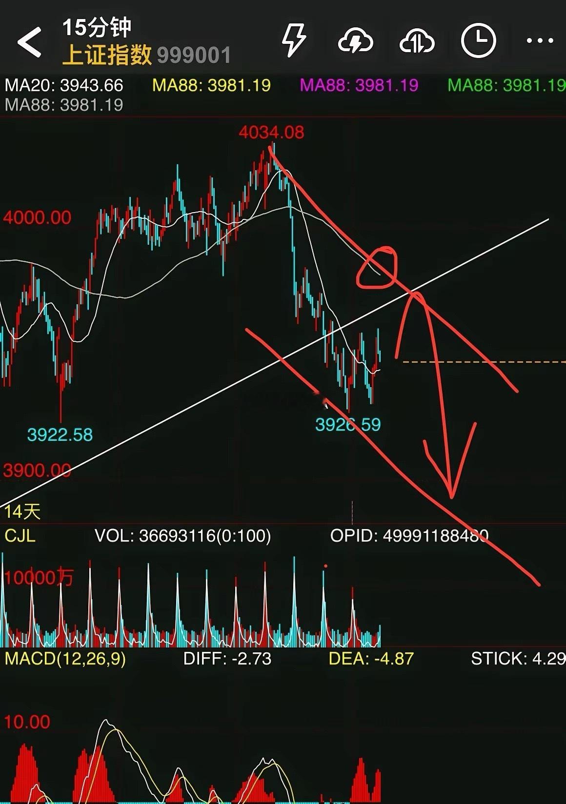 明天大盘将继续中阴线杀跌?最迟后天会再出一根破位大阴线。理由很简单:①上证指数昨天已经跌破了3140以来的上升趋势线,今天大盘无量反弹,且没有气势如虹的拉升速度,也没有收标志性的中大阳线,表明日线趋势发生改变之后已无法挽回。②从博弈的角度来说,既然多方力量已无法将价格维持在原有趋势线之上,那么空方要接管趋势就必须跌破上升趋势中的最后一个低点3922,一旦本周收在3922之下,周线K线组合将是一个标准的黄昏之星,再配合周线MACD死叉,才可以确认空方彻底掌控8月份以来的短期趋势。所以,如果这个判断正确,明天大盘最多还会反弹一天,且不能突破15分钟88线,最迟后天,大盘将再次破位大跌,收在3922之下。
