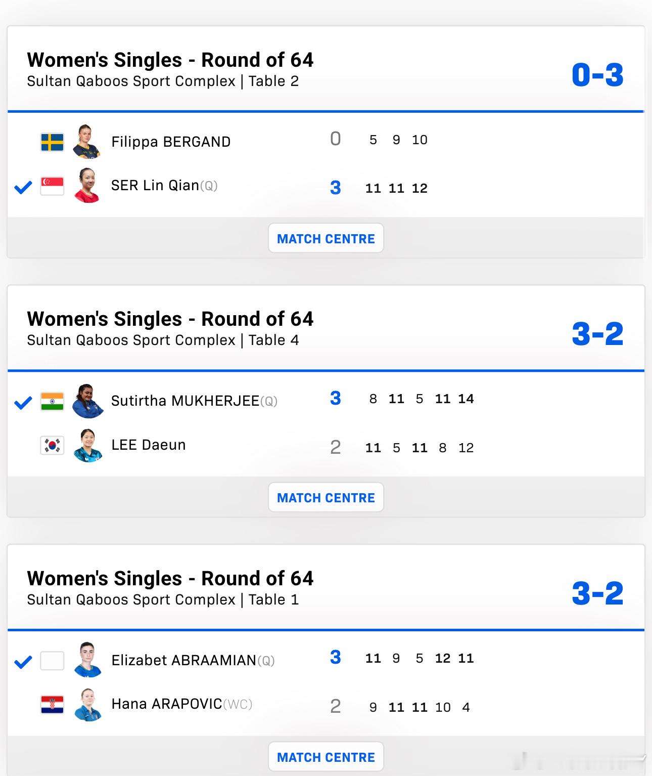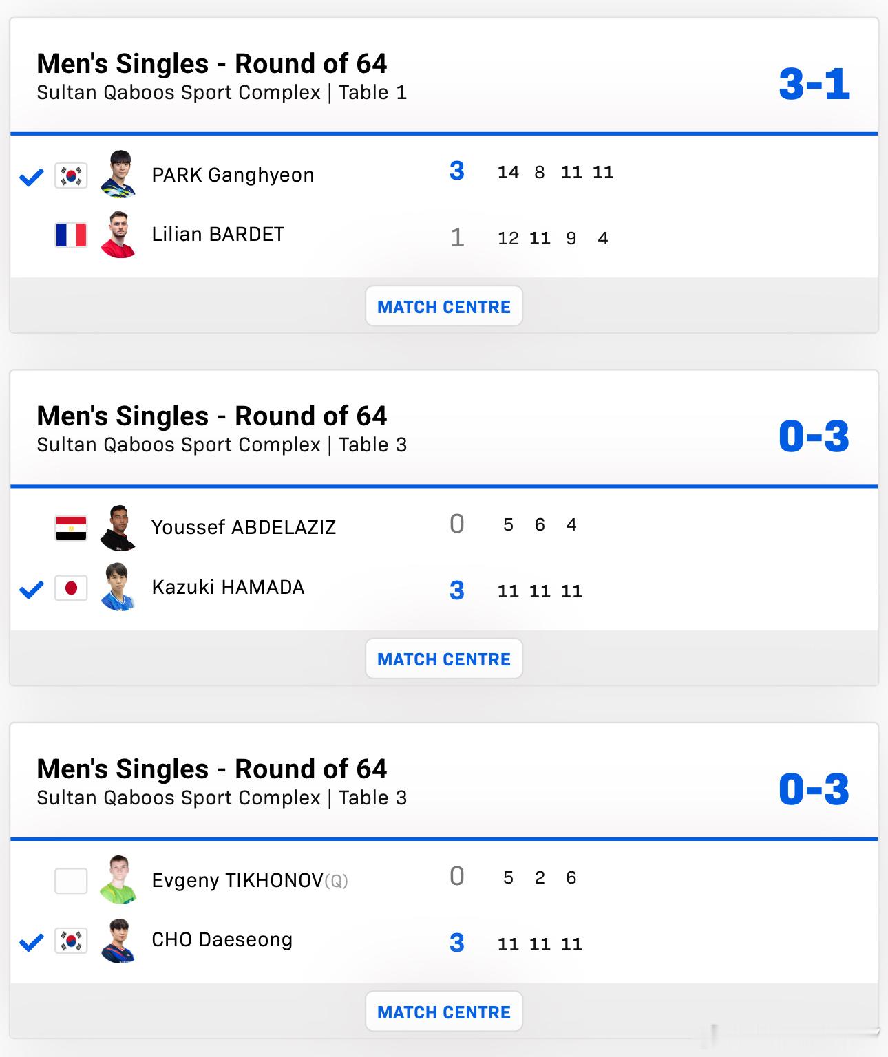 2025wtt马斯喀特球星赛男女子单打64-32朴奎炫3-1巴德滨田一辉3-0尤瑟夫赵大成3-0提霍诺夫舒麟茜3-0菲利帕苏提尔塔3-2李多恩阿尔巴米安3-2哈拉博维奇