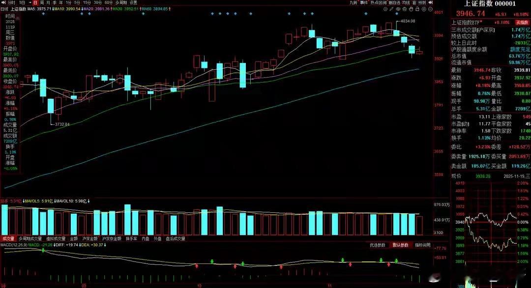专注A股市场每日实战操作,让散户投资不迷路!如果你不是长线投资者,想在A股市场中活下来,那么必须明白,周密的布局计划只能有个好的开始,严格的操盘纪律才能结出丰硕的果实!大势研判:周三A股大盘出现缩量弱反,成交量萎缩2000亿至1.74万亿,创出阶段新低。从技术形态上看,大盘周三反弹仍然收在30日线之下,说明小幅反弹并未改变市场运行趋势,短期还是偏弱形态。中期来看,30日线也是大盘的趋势支撑线,连续两日未能站稳30日线,是中期形态被破坏的重要信号!一旦30日线无法站稳,大盘短期可能回调靠拢60日线,甚至击穿60日线回撤前期平台支撑位3850点附近。创业板指同样是弱反走势,但中短期已经提前于大盘跌回箱体结构。盘面跟踪:周三沪深两市个股跌多涨少,上涨1200家,下跌4100家,亏钱效应较为明显。从板块涨跌幅上看,国际金银价格反弹带动贵金属板块大涨,贵金属大涨又带动顺周期板块走强。除此之外,锂电池、保险、养殖业、军工等表现活跃。跌幅榜上,海南本地股大幅回调,燃气、厨卫电器、多元金融、房地产等跌幅靠前。近期主线热点方面,除了锂电池走强外,其他悉数逆势下跌,且跌幅不小。由此可以看出,周三市场结构非常不健康。消息面跟踪:1、外交部表示,日本首相高市早苗的涉台错误言论从根本上损害了中日关系的政治基础,激起了中国人民的公愤和谴责。如果日方拒不撤回甚至一错再错,中方将不得不采取严厉坚决的反制措施,由此产生的一切后果由日方承担。2、荷兰经济大臣卡雷曼斯于11月19日发声明表示,已暂停对安世半导体的干预。考虑到近期的事态发展,他认为现在是采取建设性步骤的正确时机。市场资金面:周三机构和游资的操作方向趋同。机构席位买盘微幅释放,卖盘大幅萎缩,机构资金从周二大幅净流出转为小幅净流入。可以看出,机构虽然有净流入,但并不是在抄底,只是惜售情绪增加。游资买盘中幅释放,卖盘小幅萎缩,游资从流入流出持平,转为大幅净流入,游资在抄底。板块资金流向上,机构和游资没有合力加仓和减仓的主线热点。分开来看,游资几乎没有买入任何主线热点,机构加仓存储芯片和创新药,继续减仓了锂电池。由于机构并未大幅加仓其他板块,所以短期内暂时不会有新主线顶上来。