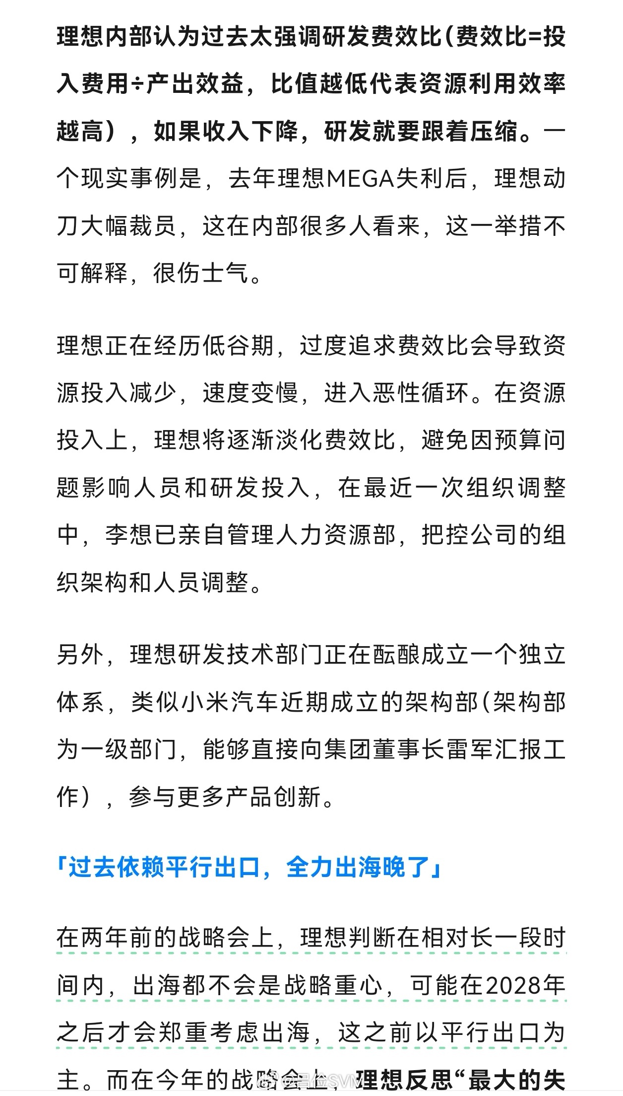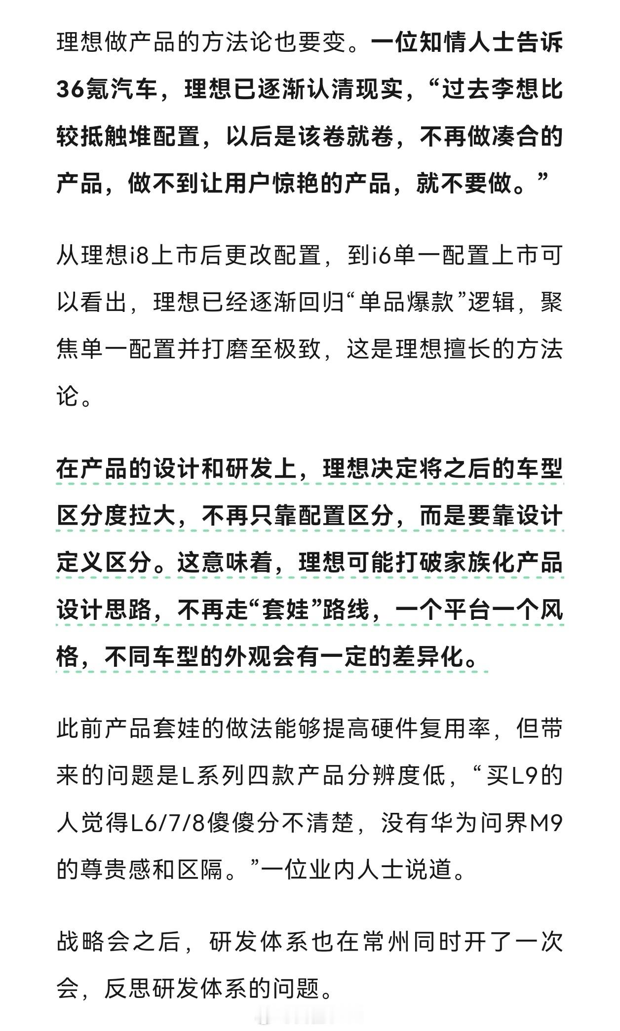 理想战略会:认为自己节奏慢了:“现在遇到的问题是,我们出一次牌,同行们会出两次牌。我们的迭代频率相当于同行们看着我们的牌和我们打牌。”低估了小米:小米YU7的爆单升级了中国汽车市场的激烈战况。后面不可避开的竞争,明年华为鸿蒙智行仅是明年规划车型就有25款。产品定义调整:“区分度拉大,不再只靠配置区分,而是要靠设计定义区分。这意味着,理想可能打破家族化产品设计思路,不再走“套娃”路线,一个平台一个风格,不同车型的外观会有一定的差异化。”研发:“逐渐淡化费效比,避免因预算问题影响人员和研发投入”。加速布局出海。我的一点点看法:价格更低的增程可替代产品越来越多,价格相仿的鸿蒙产品智能化深入人心。他们自己建的围城,暂时自己跳不出来了。