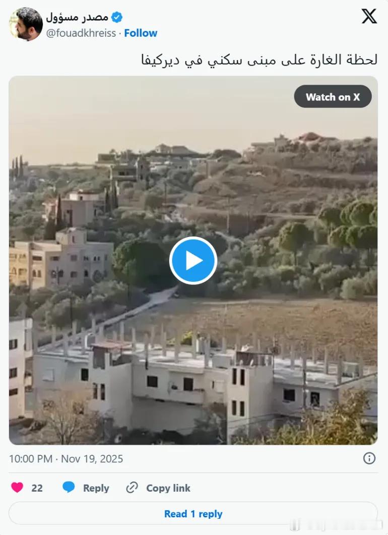 视频显示以色列炸弹袭击代尔基法村的瞬间 经半岛电视台核实,社交媒体上的视频显示,以色列空袭了黎巴嫩南部村庄代尔基法的一栋建筑。 以色列军方在袭击发生前约90分钟曾威胁要袭击该村。图1 翻译:袭击代尔基法村一栋居民楼的瞬间