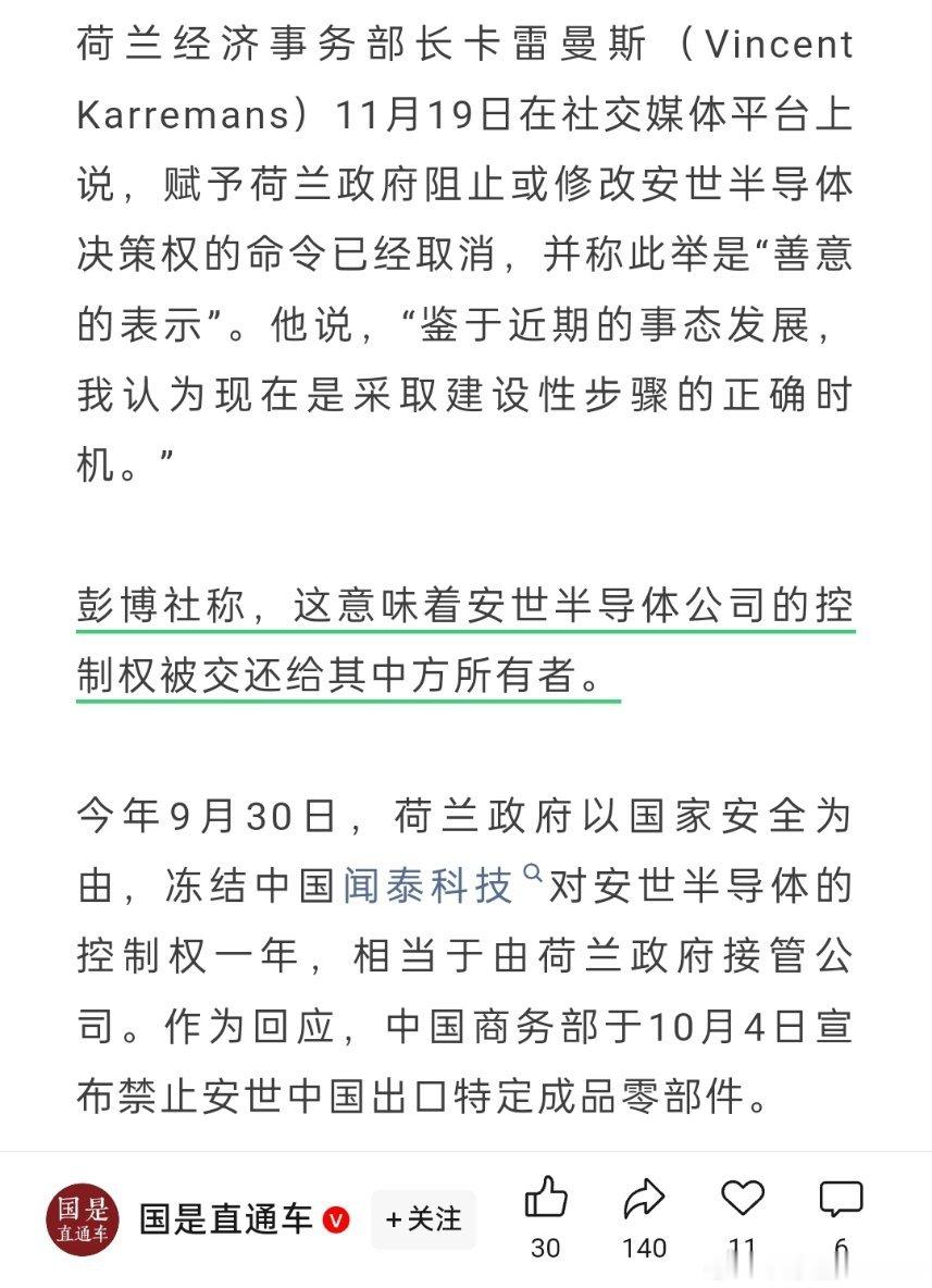 荷兰人不老实,尽管荷兰宣布暂停对安世半导体的干预,名义上把安世半导体的控制权还给了中方所有者,但实际上,闻泰科技公司对安世半导体的控制权仍然在受限状态。当面一套,背后一套,小人。