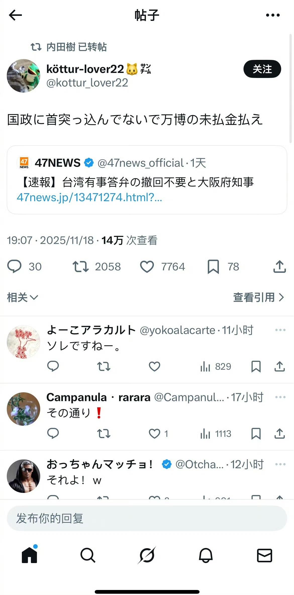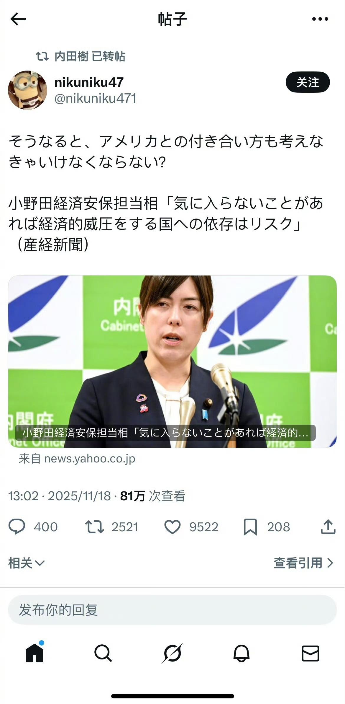 中国按照自己的节奏给日本上强度后,很多反对高市轻易破坏中日关系的大V、学者以及普通日本人,都纷纷敢于冒着被打成非国民的风险,出来发言了。 甚至那个美日混血的经济安保大臣小野田纪美想趁机捞一把人气,跳出来说“依赖一不满意就使用经济威压的国家,是有风险的”,结果就被日本人直接批判:说这话时不想想美国对日本什么样?转评区也有很多人说,怎么不说美国随便加关税、还炫耀逼迫日本投资几千亿的评论。 还有大阪知事说不需要撤回台湾有事的表态,结果有日本人说“不要插手国政,支付世博会的欠款”,转发也2000多,下面很多同意的。 今天还有人说,中国知道罪责只在高市一人,而不在全体日本人,所以高市应该谢罪、不应该只舔美国,而应该也跟中国搞好关系的热帖,这些声音已经不是吉祥物或者十里淘金般的存在了,很有声势。 高市已经走入了中方用阳谋预设的战场。我们要对自己的实力优势有信心,也要对用实力催化出日本理智声音的前景有耐心。 日本人其实比想象中更怂,毕竟几十年早就被美军驯化了。对他们来说见风使舵其实并没有任何心理压力。