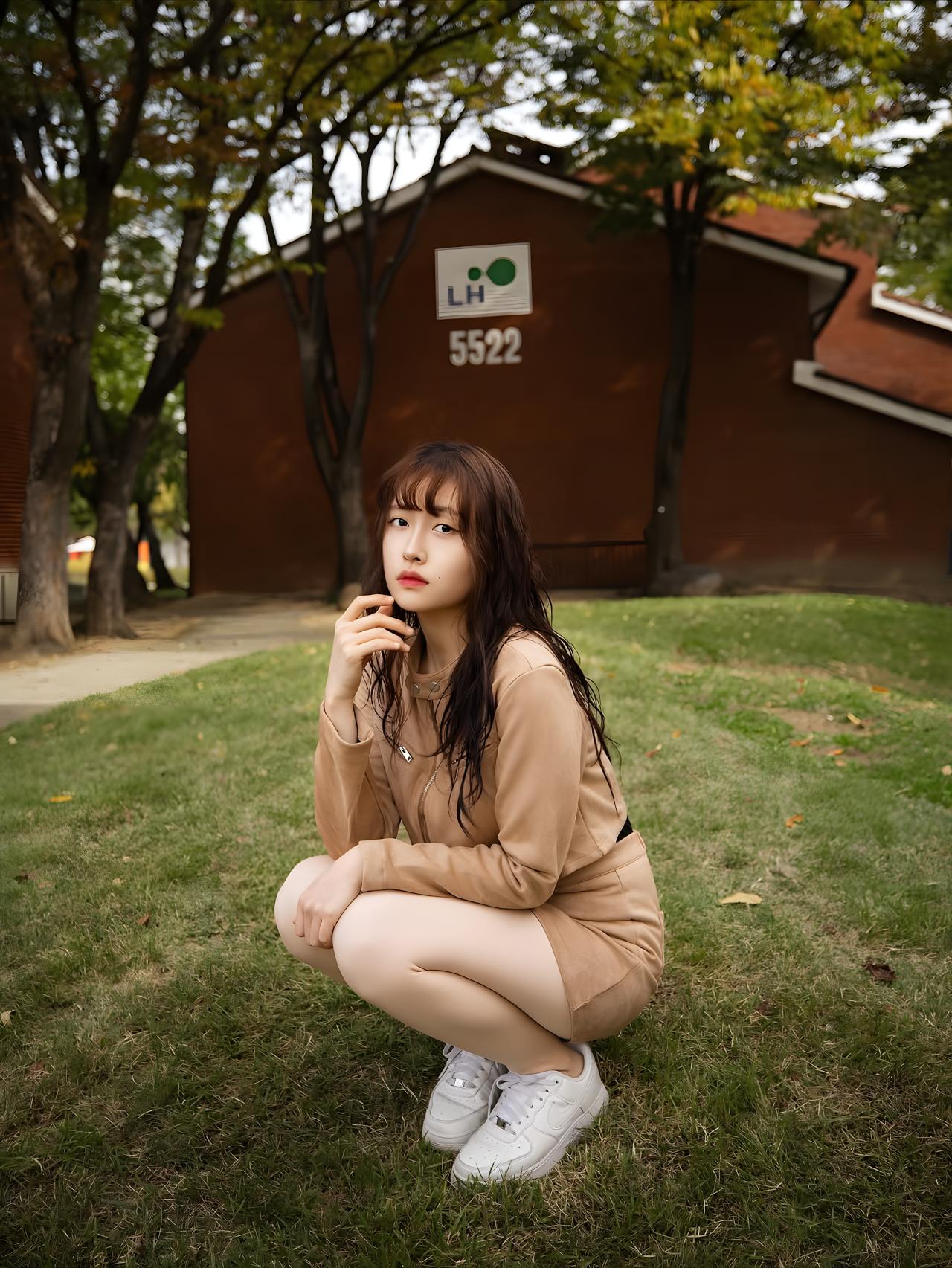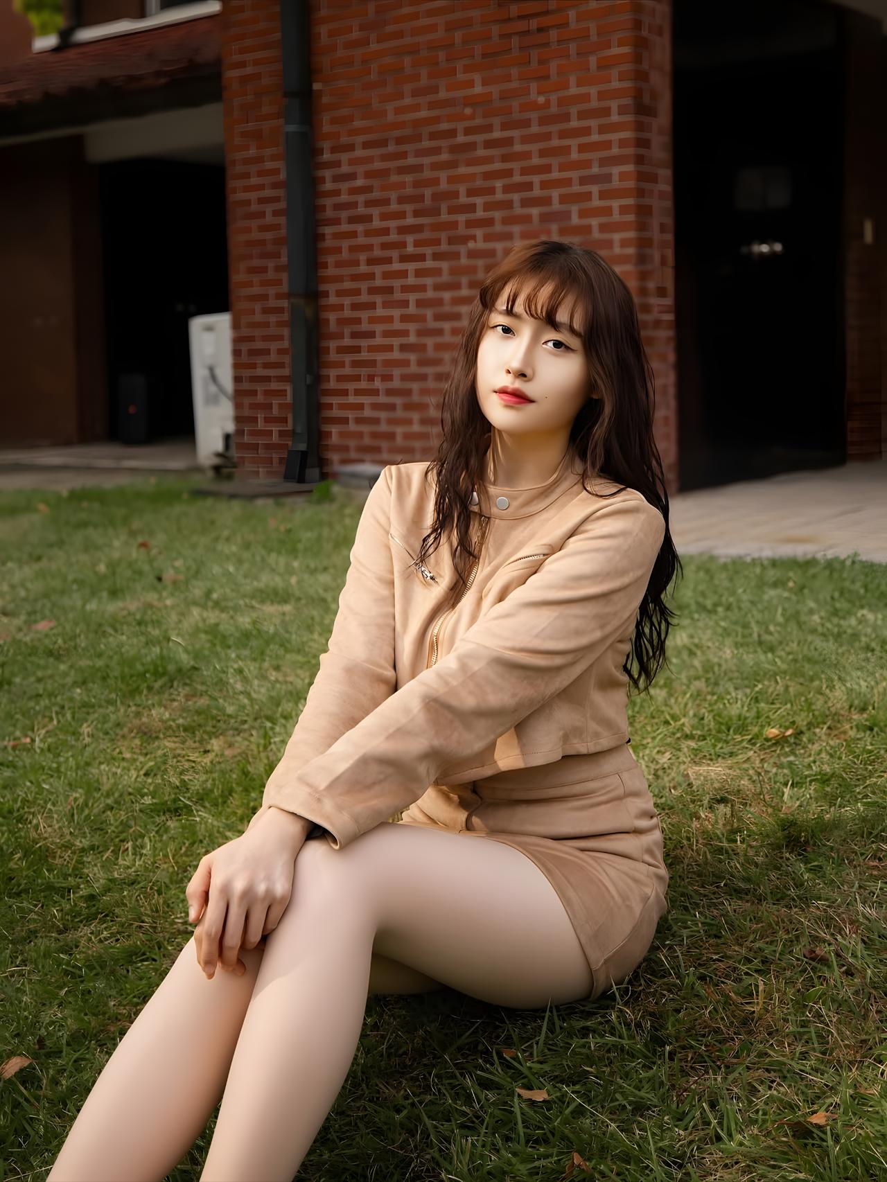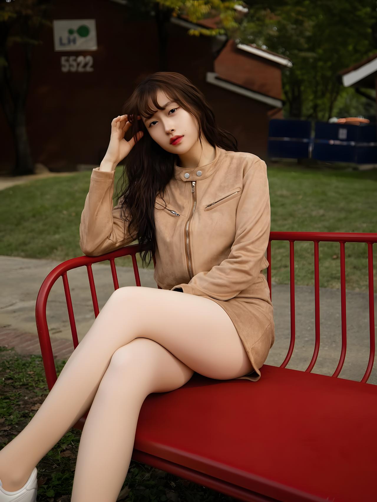 在户外那一片宁静的天地里,她静静地坐在红色的椅子上。米色的长袖连衣裙,简洁大方,拉链和金属扣的点缀,让这件裙子增添了几分时尚感。她的头发自然地披在肩上,左手轻轻托着发丝,姿态优雅而迷人。 她穿着肉色的丝袜,双腿交叉着,一双白色的鞋子更显得她整个人清新脱俗。周围的背景是水泥路和绿色的草地,还有一些模糊的建筑物,这一切都营造出一种祥和宁静的氛围。柔和的光线洒在她身上,让她的柔美气质更加凸显。她仿佛与这周围的环境融为一体,享受着这难得的午后时光,一切都显得那么自然、那么美好。