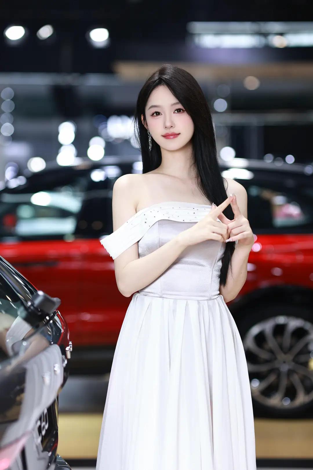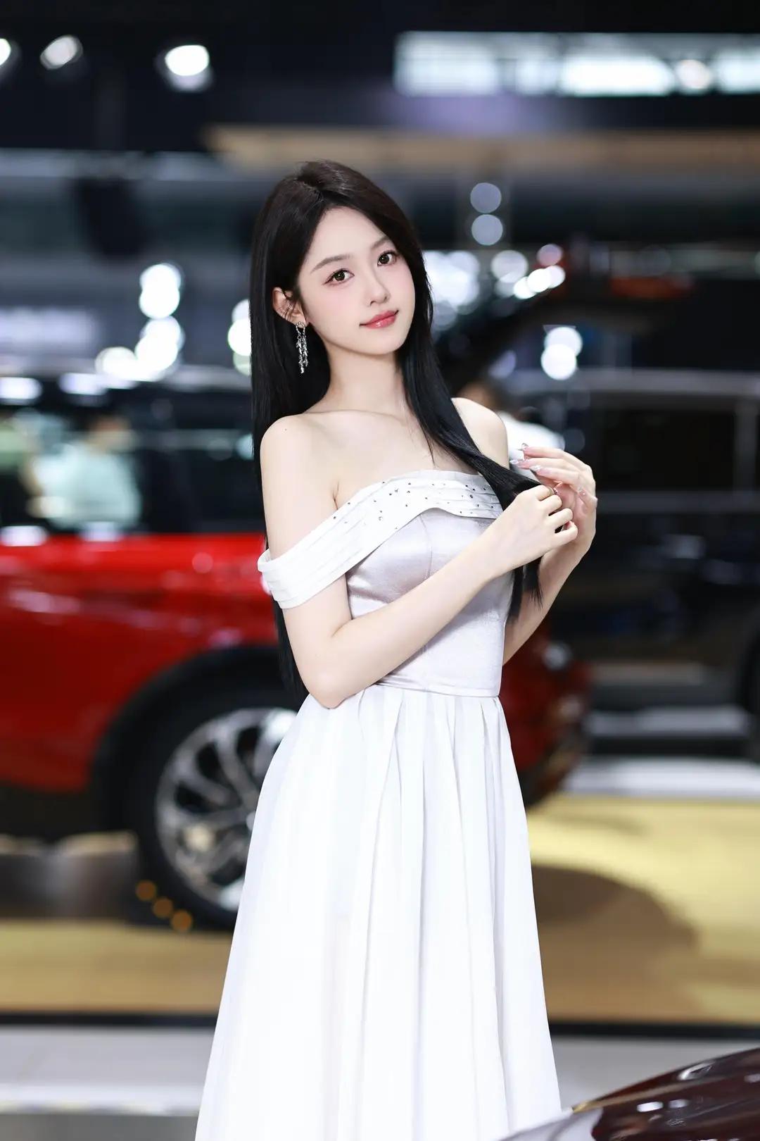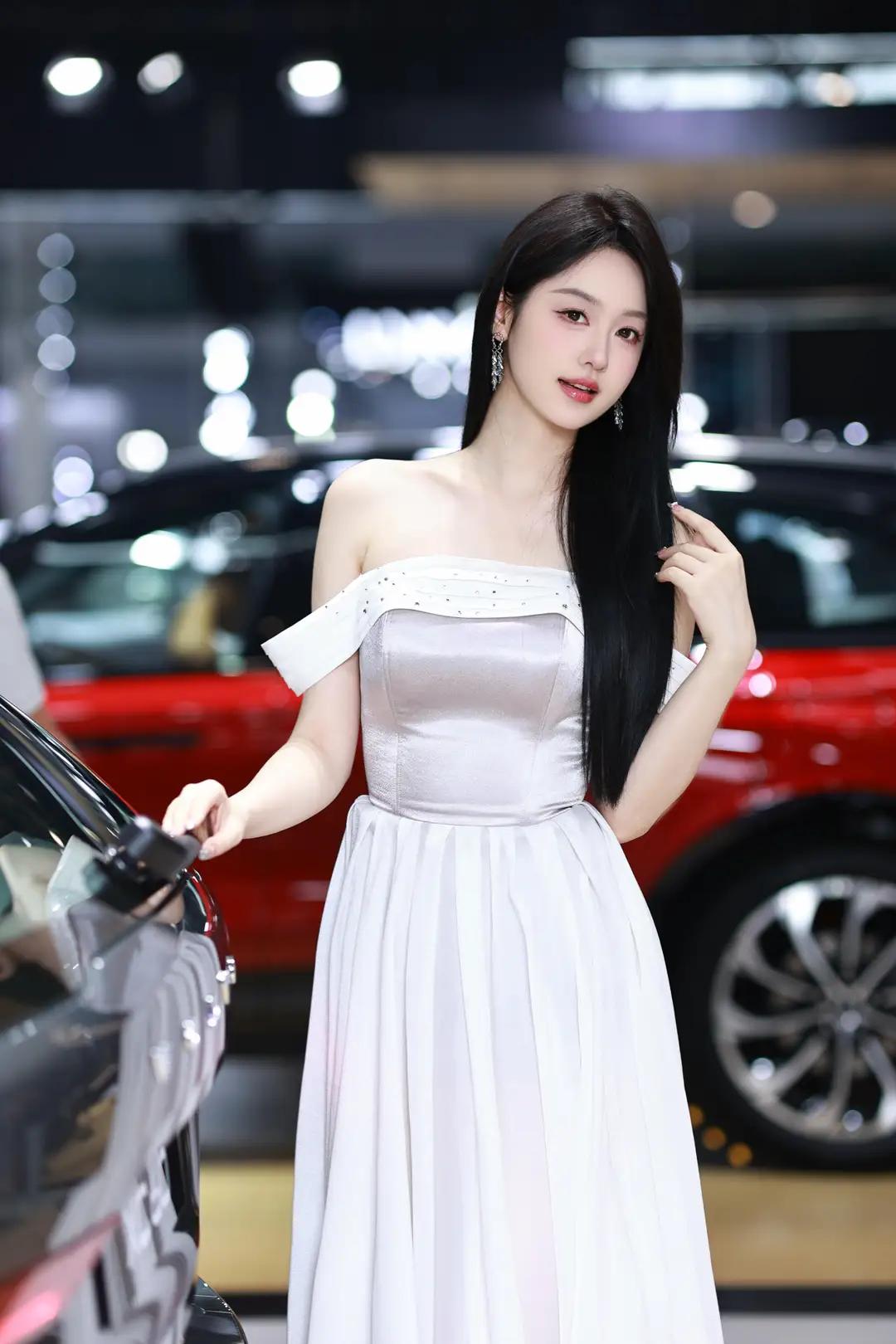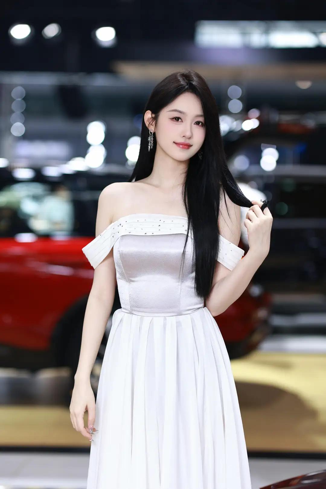 《光影中的自信》 在柔和而明亮的光线下,她宛如一颗璀璨的明珠,静静地绽放在车展的热闹场景中。一袭白色露肩长裙,简洁而不失优雅,肩部的装饰带如同点睛之笔,让她更显大方得体。那乌黑的长发如瀑布般披散在肩头,每一丝都闪耀着柔顺的光泽,与她的自信微笑交相辉映。 她那修长的手指轻轻抬起,指尖涂抹着浅色的指甲油,仿佛在向世界展示着她的精致与细腻。她的笑容中蕴含着无尽的自信,那是一种从内而外散发出的魅力,让周围的一切都黯然失色。在她的身后,一辆红色的汽车格外醒目,它那流畅的线条和鲜艳的色彩,仿佛也在为她的美丽与自信喝彩。 整个环境热闹而专业,柔和的光线洒在每一个角落,营造出一种现代而优雅的氛围。她与这个场景完美地融合在一起,成为其中最亮丽的风景线。她站在那里,就像一位掌控全局的女王,用她的自信和美丽,诠释着现代女性的独特魅力。无论是那优雅的长裙,还是那自信的微笑,都让人无法忘怀,仿佛时间在这一刻静止,只为让她尽情绽放。