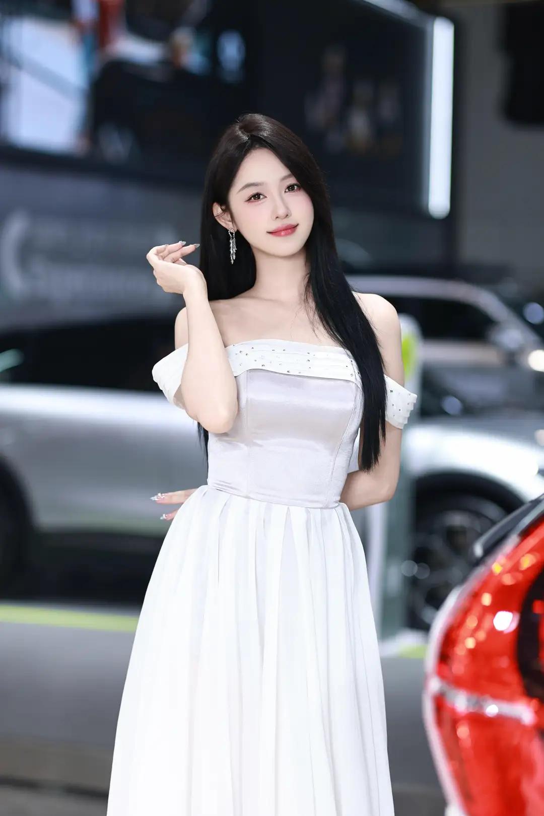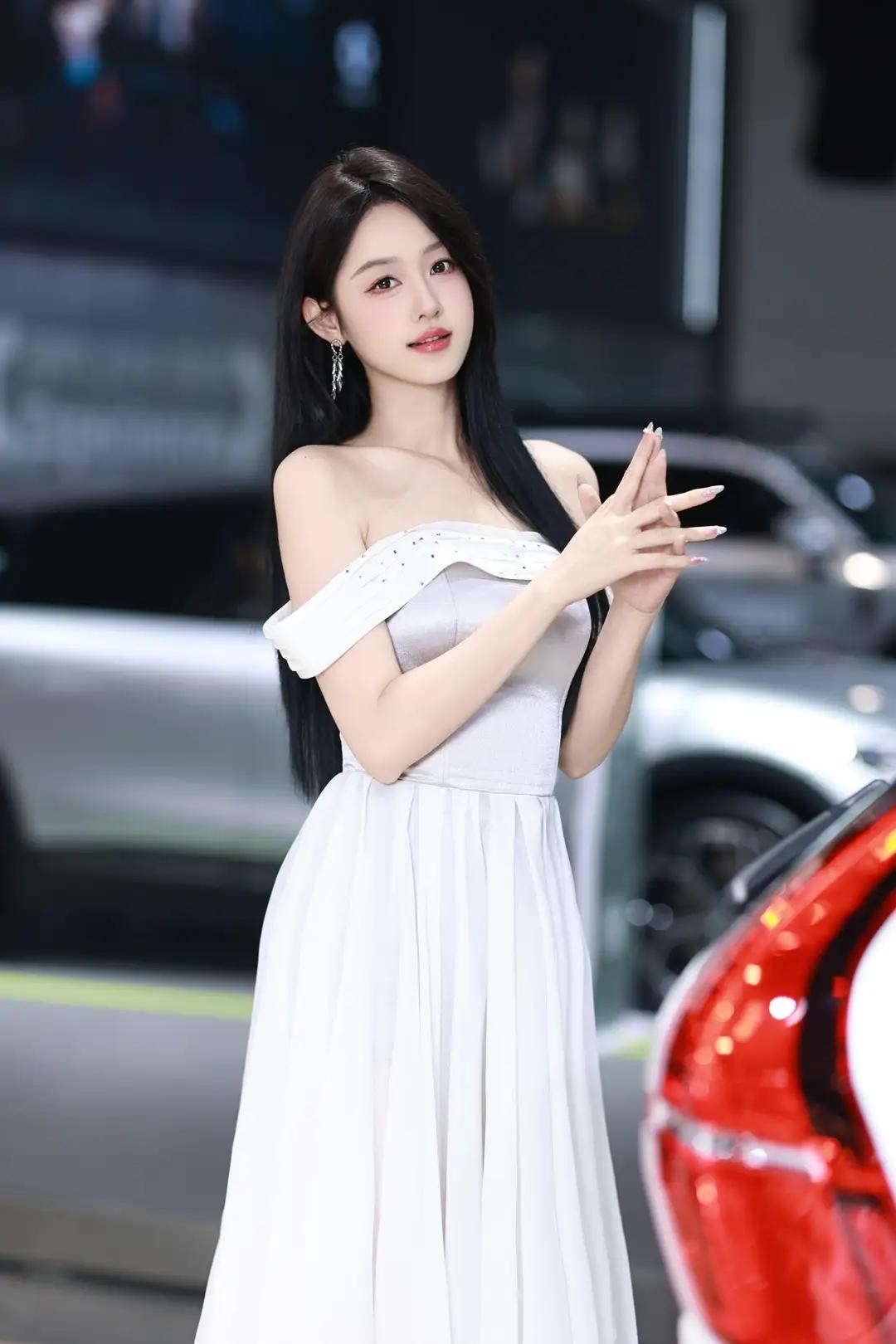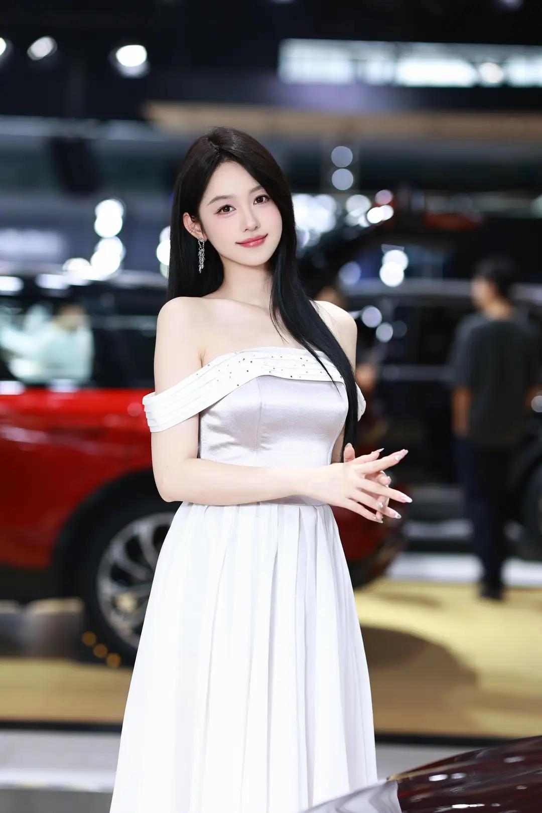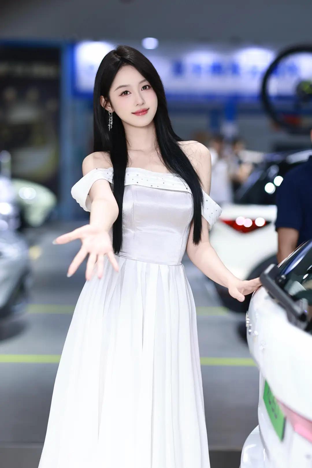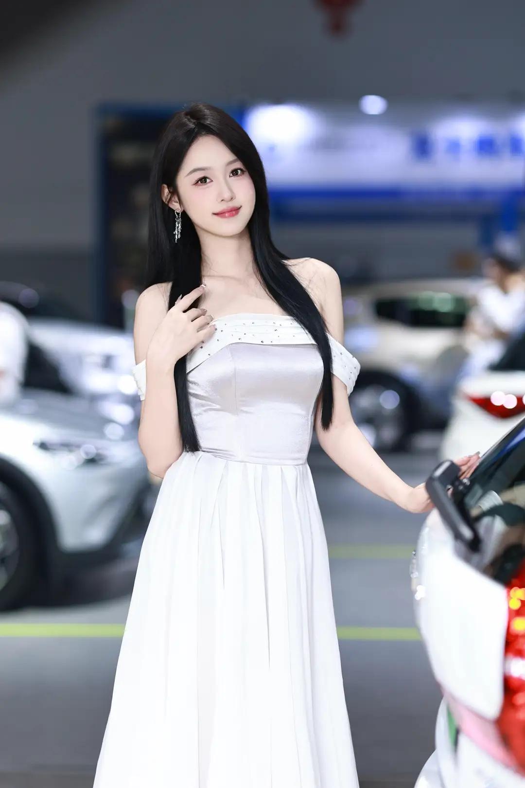 《光影中的自信》 在柔和而明亮的光线下,她宛如一颗璀璨的明珠,静静地绽放在车展的热闹场景中。一袭白色露肩长裙,简洁而不失优雅,肩部的装饰带如同点睛之笔,让她更显大方得体。那乌黑的长发如瀑布般披散在肩头,每一丝都闪耀着柔顺的光泽,与她的自信微笑交相辉映。 她那修长的手指轻轻抬起,指尖涂抹着浅色的指甲油,仿佛在向世界展示着她的精致与细腻。她的笑容中蕴含着无尽的自信,那是一种从内而外散发出的魅力,让周围的一切都黯然失色。在她的身后,一辆红色的汽车格外醒目,它那流畅的线条和鲜艳的色彩,仿佛也在为她的美丽与自信喝彩。 整个环境热闹而专业,柔和的光线洒在每一个角落,营造出一种现代而优雅的氛围。她与这个场景完美地融合在一起,成为其中最亮丽的风景线。她站在那里,就像一位掌控全局的女王,用她的自信和美丽,诠释着现代女性的独特魅力。无论是那优雅的长裙,还是那自信的微笑,都让人无法忘怀,仿佛时间在这一刻静止,只为让她尽情绽放。