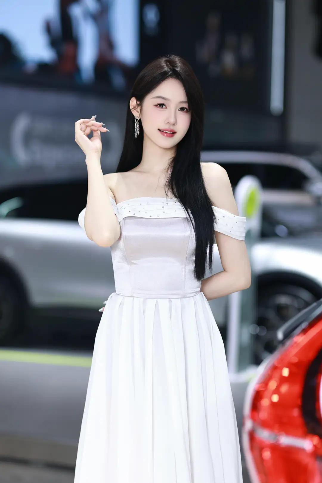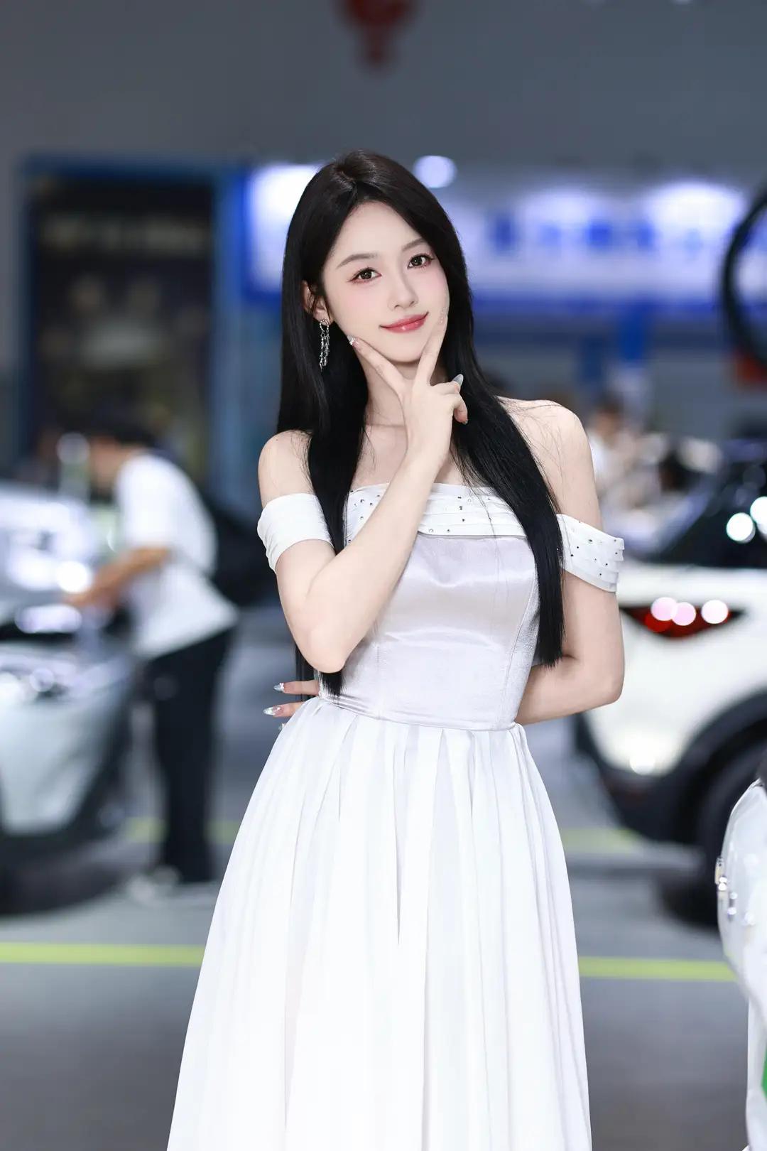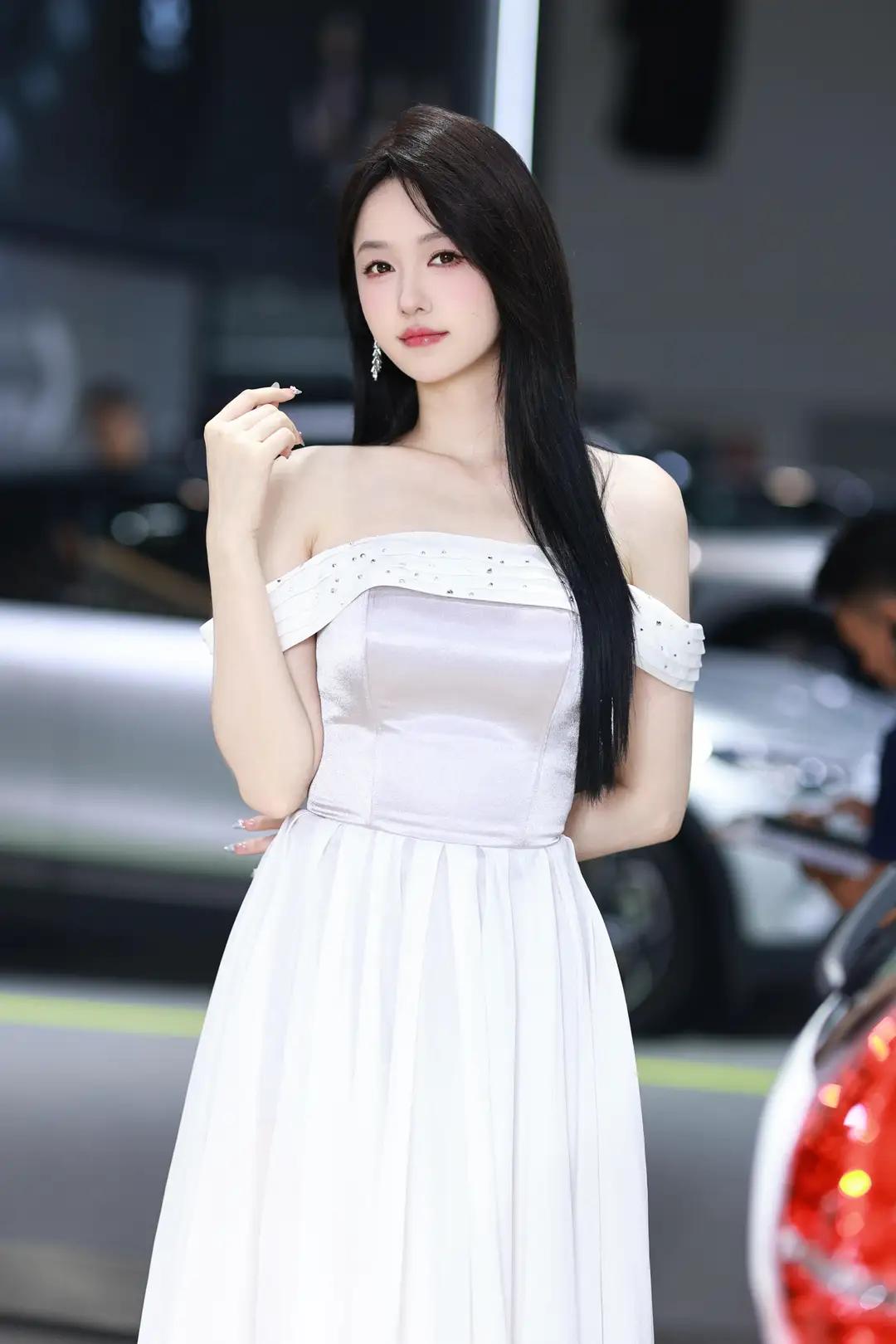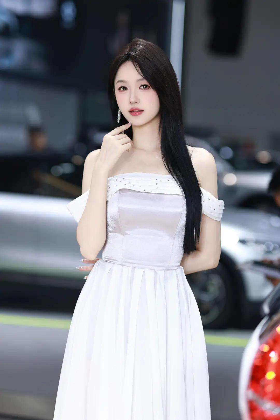 《光影中的自信》 在柔和而明亮的光线下,她宛如一颗璀璨的明珠,静静地绽放在车展的热闹场景中。一袭白色露肩长裙,简洁而不失优雅,肩部的装饰带如同点睛之笔,让她更显大方得体。那乌黑的长发如瀑布般披散在肩头,每一丝都闪耀着柔顺的光泽,与她的自信微笑交相辉映。 她那修长的手指轻轻抬起,指尖涂抹着浅色的指甲油,仿佛在向世界展示着她的精致与细腻。她的笑容中蕴含着无尽的自信,那是一种从内而外散发出的魅力,让周围的一切都黯然失色。在她的身后,一辆红色的汽车格外醒目,它那流畅的线条和鲜艳的色彩,仿佛也在为她的美丽与自信喝彩。 整个环境热闹而专业,柔和的光线洒在每一个角落,营造出一种现代而优雅的氛围。她与这个场景完美地融合在一起,成为其中最亮丽的风景线。她站在那里,就像一位掌控全局的女王,用她的自信和美丽,诠释着现代女性的独特魅力。无论是那优雅的长裙,还是那自信的微笑,都让人无法忘怀,仿佛时间在这一刻静止,只为让她尽情绽放。