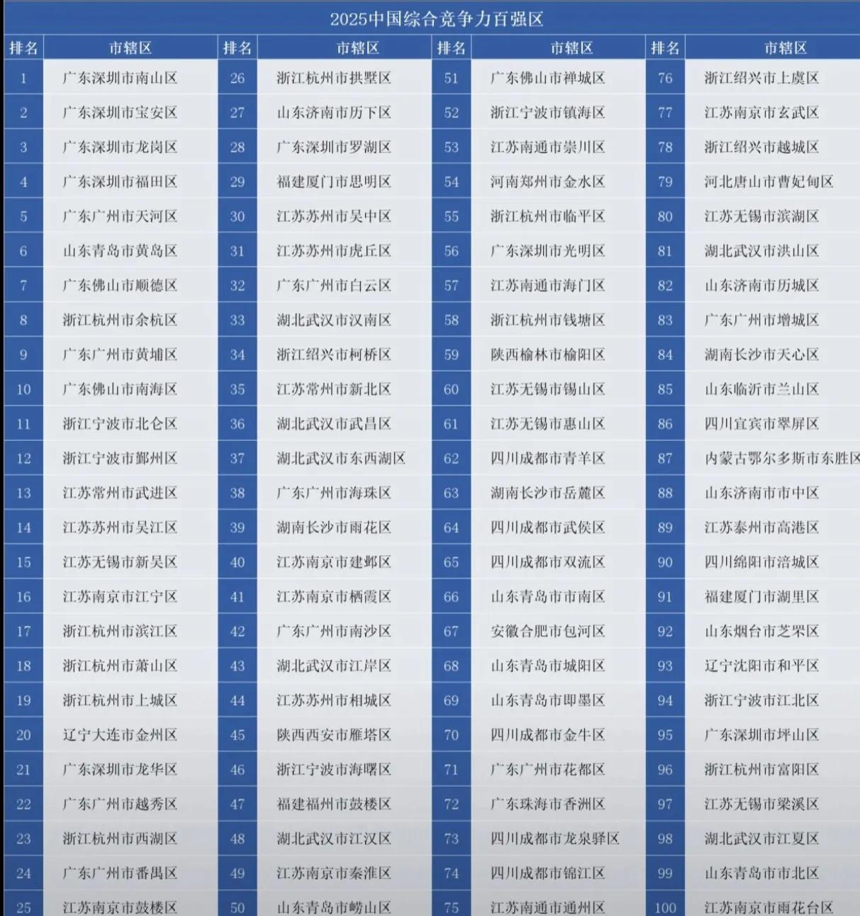 2025年中国百强县百强区出炉啦!有你的家乡么?11月18日公布了两个榜单,在2025年百强县(县级市)中,前十名江苏一省占了6席,并且前四名全是江苏的;经济第一省的广东只有2个县市进入百强但排名靠后,博罗县81名,四会市99名。而在2025年百强区中,广东是大赢家,占了21席,前十名广东占了8席,前五名全是广东的。