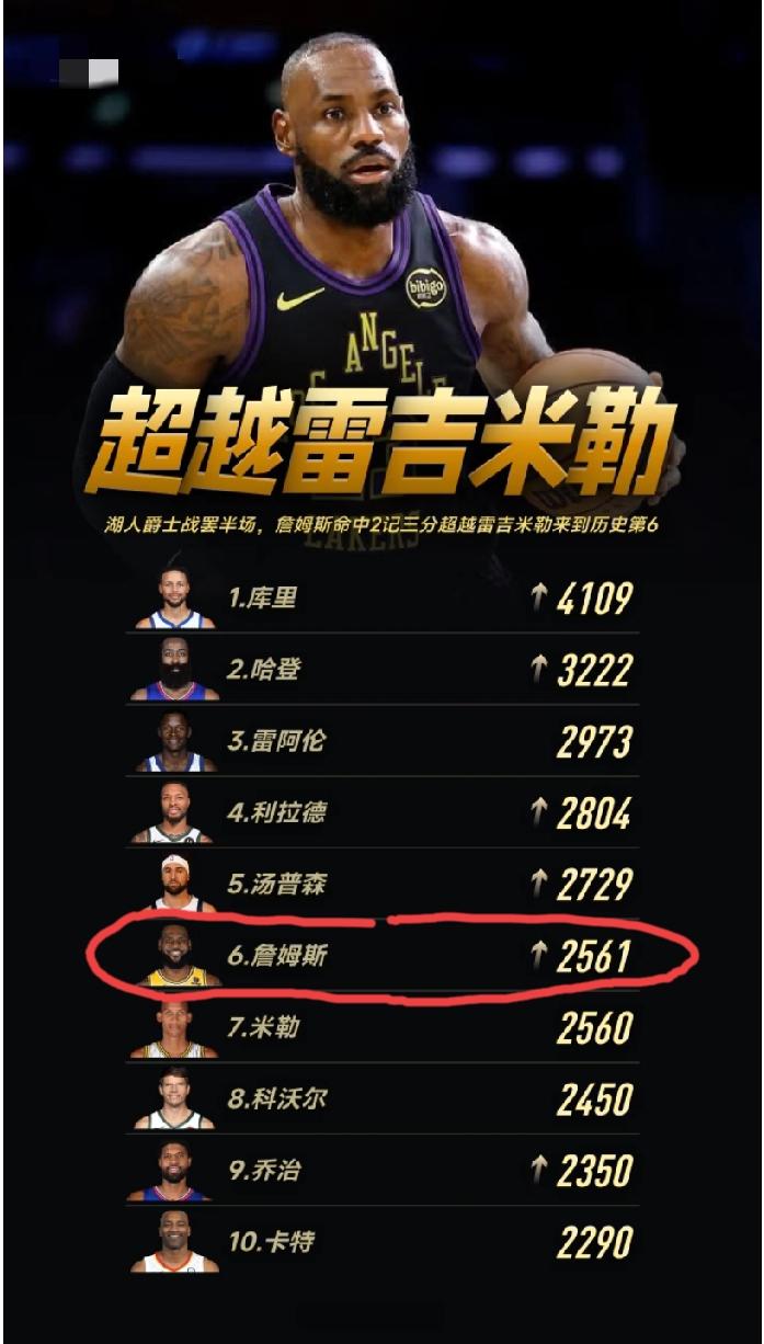 勒布朗詹姆斯又解锁一新成就:职业生涯三分球命中数量超越nba历史上传奇三分投手雷吉米勒! 这一成就是詹姆斯在今天湖人和爵士的比赛中达成的,本场比赛詹姆斯总共命中2记三分,全场拿到11分12个助攻,帮助湖人以140:126击败了爵士。 不过,看nba这个历史三分榜单,詹姆斯要想再前进一步,基本已经没有任何可能了,因为排在他前面的都是现役球员,而且基本都会比他晚退役!