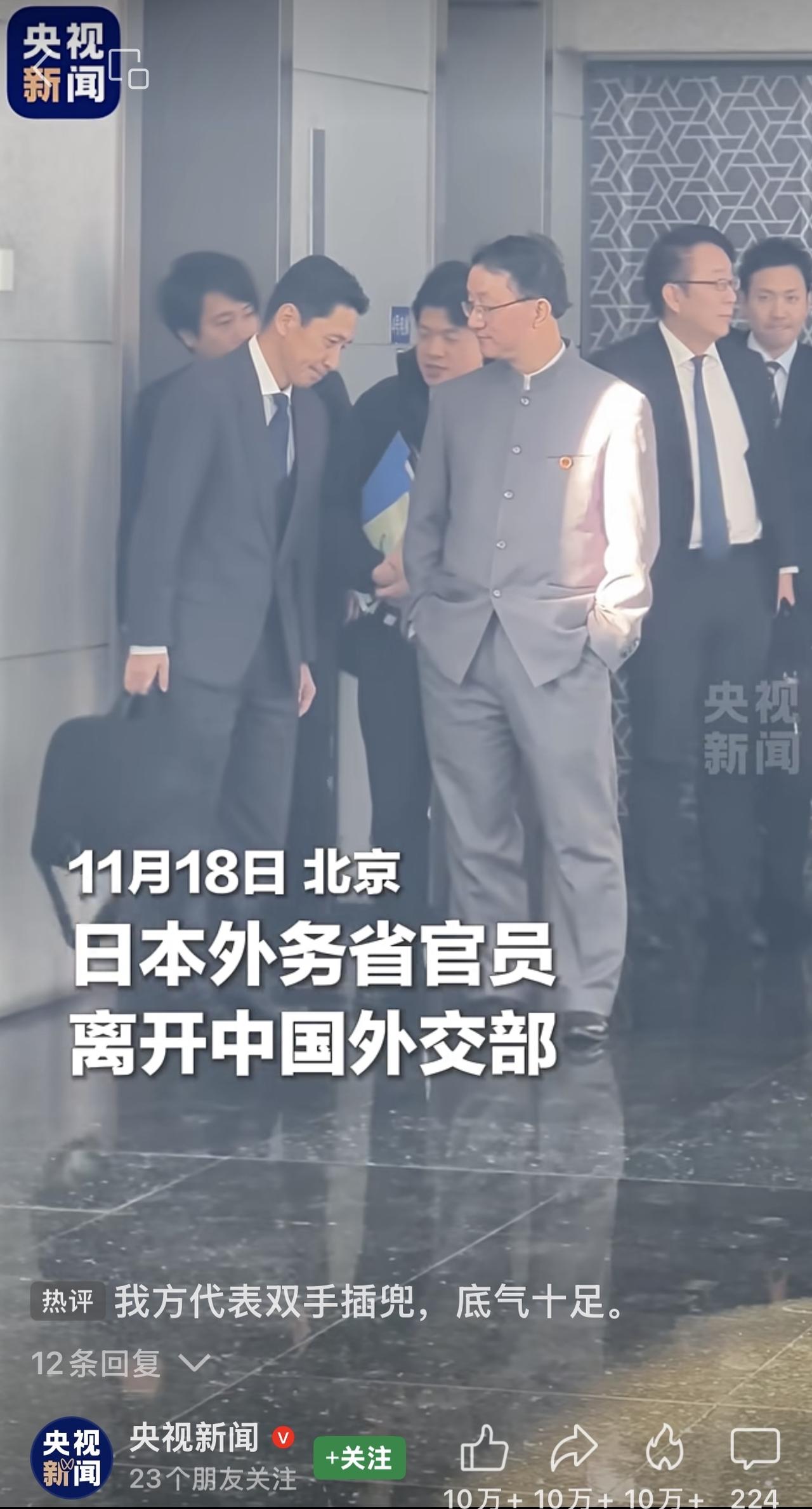 日方称,中方媒体“玉渊谭天”未协调即发布“日本官员低头听中方讲话”的视频,日方已就此提出交涉。这段视频在“玉渊谭天”账号上已查询不到。