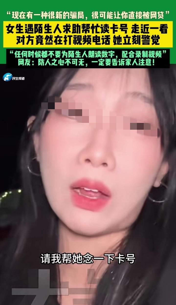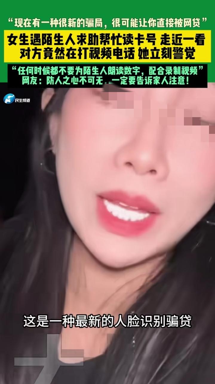 近日山东济南,一36岁女子在商场逛街,突然,过来一个大姐找她帮忙,让她帮忙念下卡号,女子靠近一看发现不对劲! 女子靠近这大姐一看,她正在视频通话,对方一直盯着屏幕,女子立马感觉不对劲,对大姐说:我也看不清卡号,你去找工作人员吧!这大姐听女子这么说,立马扭头就走了! 女子事后发现,这是一种新型的网贷骗局,利用你帮她念卡号的这个动作,录制下你的面部表情和声音等信息,通过AI模型,就可以制作出你的人脸验证信息,然后就去各种网贷上贷款,钱会自动从你卡里转走,半个小时就可能让你背负几十万的贷款!出门在外,一定要警惕这种骗局,多个心眼! 济南头条
