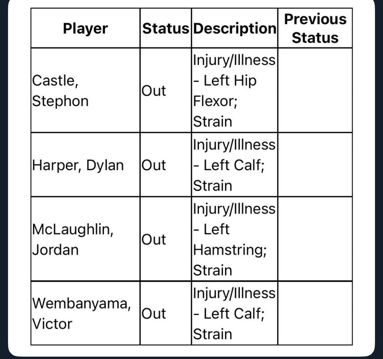 🏥马刺伤病报告:文班亚马、卡斯尔、哈珀与麦克劳林均缺席明日对阵老鹰队的比赛