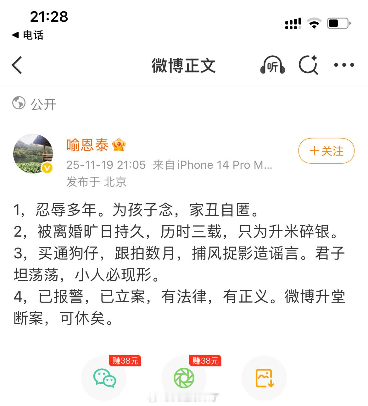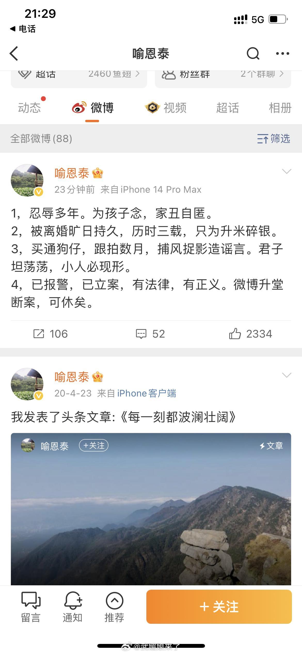 喻恩泰时隔五年首次发博回应离婚称因为孩子忍辱多年,目前已报警已立案 狗血在生活中也是存在的