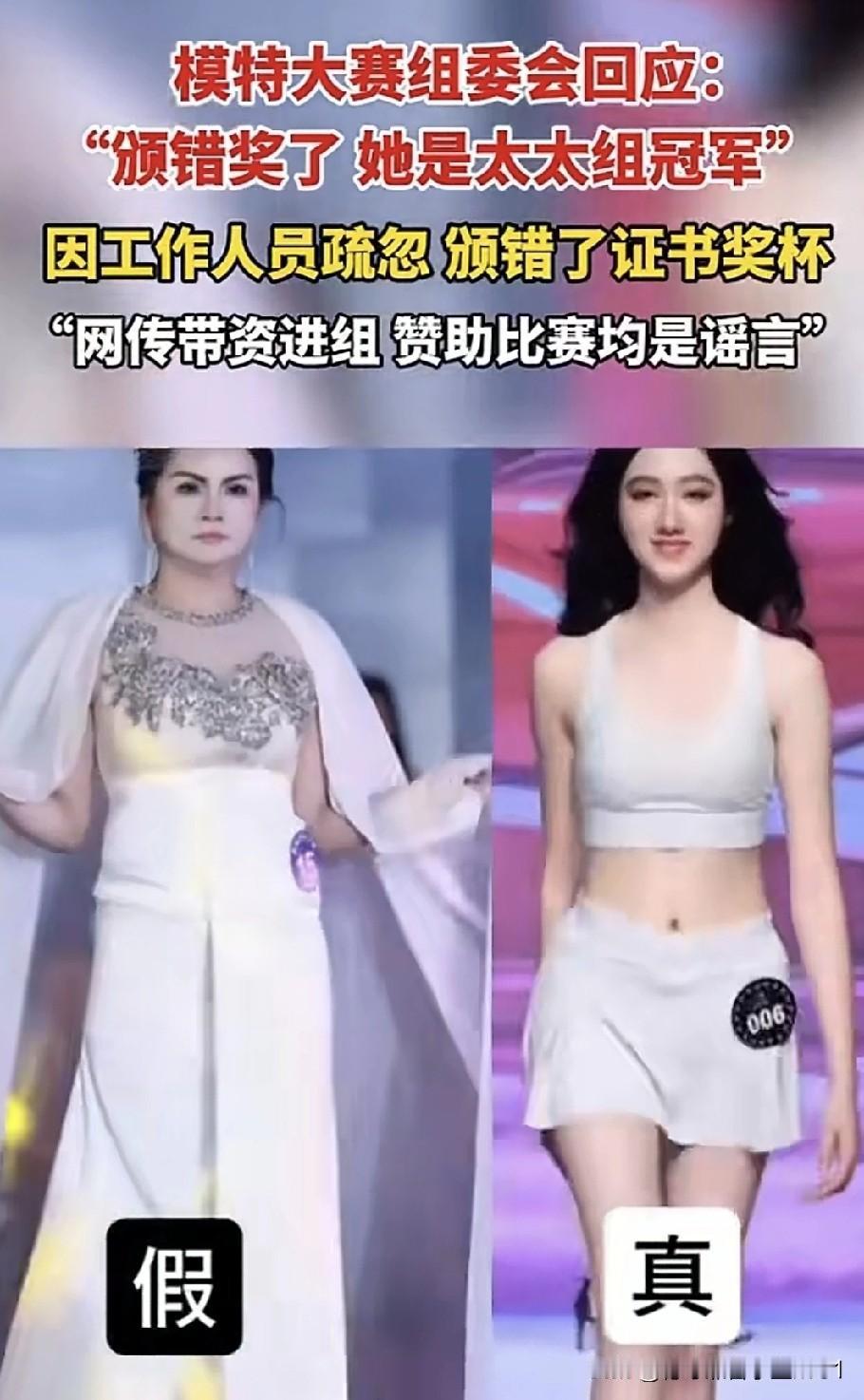 你敢相信吗? 颁奖还能颁错? 主办方针对模特大赛15号选手夺冠引发的争议事件作出回应,表示会给出一个结果。 结果揭晓,原来是颁错奖了,15号选手本是太太组冠军。只因工作人员疏忽,错发了证书和奖杯。不得不说,这解释倒也说得头头是道。可既然是太太组,后面一排的其他人却看起来十分年轻,这该作何解释? 我们能否一睹“太太组”其他参赛选手的风采呢?说这是太太组,实在难以令人信服,广东太太就是这般模样吗?组委会还是再斟酌个说法吧! 当时,15号选手头戴后冠,肩披锦带,手捧鲜花与证书,正在进行颁奖仪式,这么多工作人员竟都疏忽了? 如今事情曝光,就说是颁错奖了,那要是没被曝光呢? 如此幼稚的圆场说辞,着实可笑。若真是工作人员失误,这比赛的水准也太差劲了吧! 组委会此举并非“疏忽”,而是对赛事和选手极度的不负责!颁奖这么严肃的场合,都能发错证书和奖杯,暴露出的是组织混乱、态度敷衍。拿“乌龙”当借口,实在愧对选手的付出和公众的信任! 全国网友,除了广东网友,有谁会相信这番说辞呢? 对此大家怎么看?