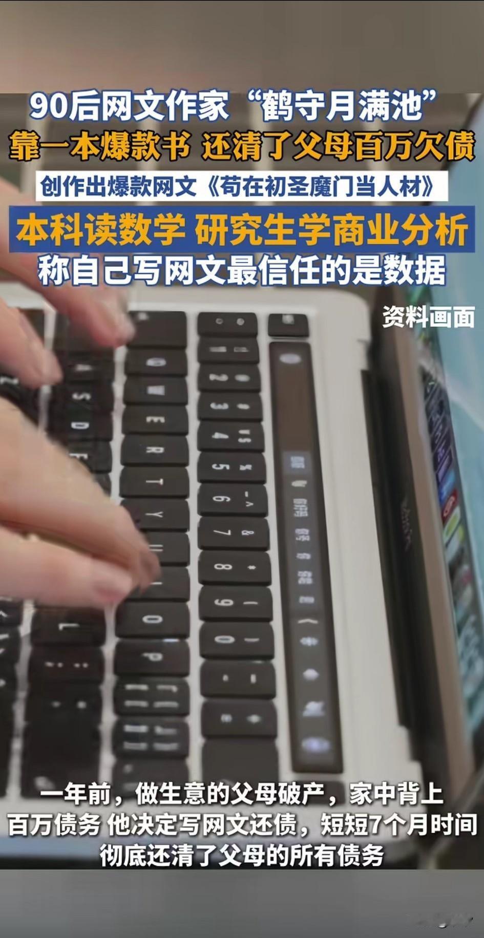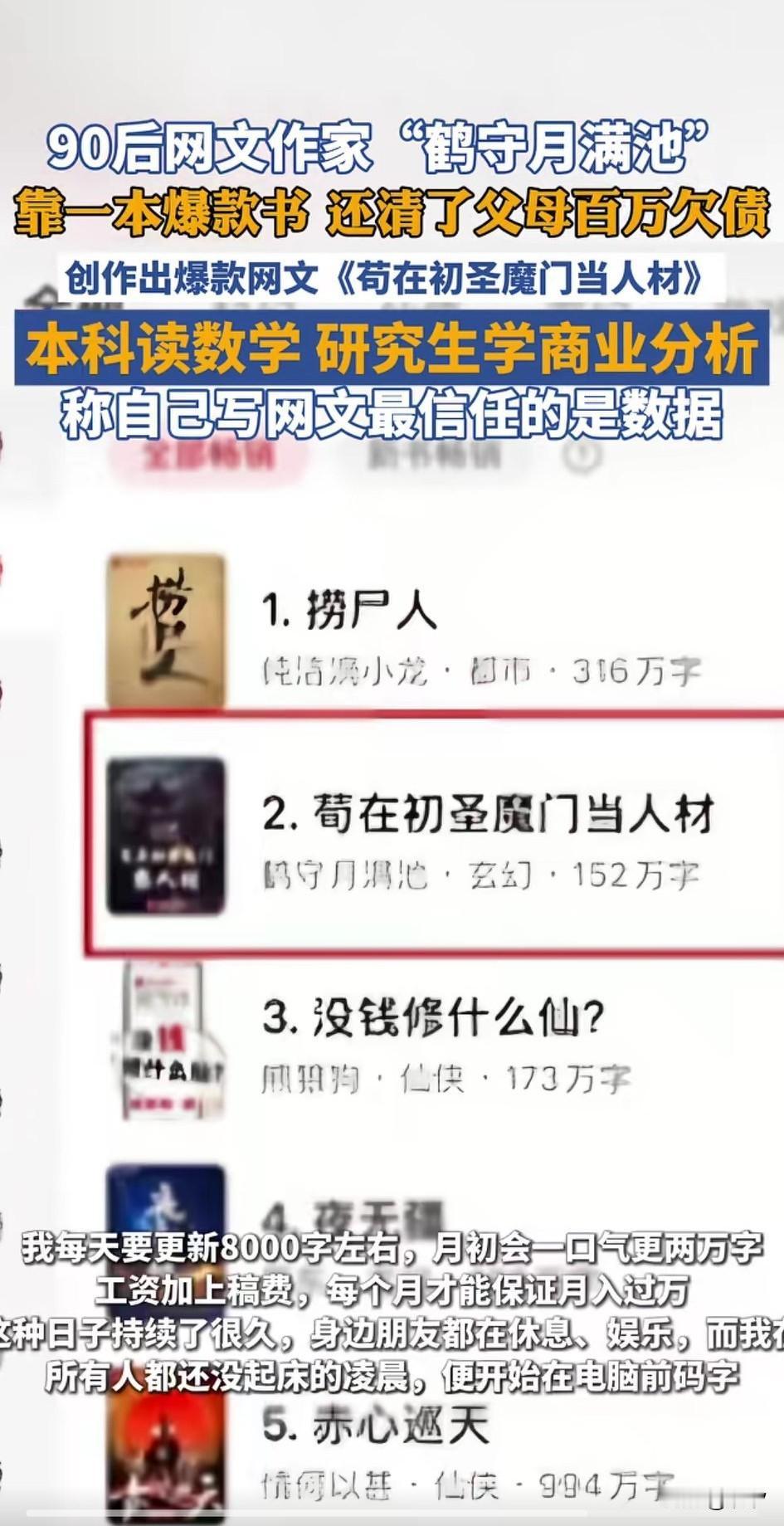 90后网文作家鹤守月满池, 写出了爆款小说《苟在初圣魔门当人材》用了7个月直接还清了父母的百万欠债,他每天五点半起床写小说, 一下写到九点半, 之前白天工作晚上写小说, 两者加起来才能月入过万, 每天坚持8000字, 月初的时候更新两万字, 他刚开始也是全面撒网, 看很多平台的榜单, 有些作品数据不好他就直接切了, 重新开始了新的小说, 就这样坚持了好久, 谁能想到他本科学的是数学, 研究生学的是商业分析, 称自己写网文最信任的是数据, 身边的朋友在娱乐休息, 而他却在努力码字, 谁的成功都不是容易的, 都是努力得来的, 很佩服这样自律的人, 大家有没有看过这本网络小说? 网文 我养你文学 每日自创小说 龙域之主小说 未成文学