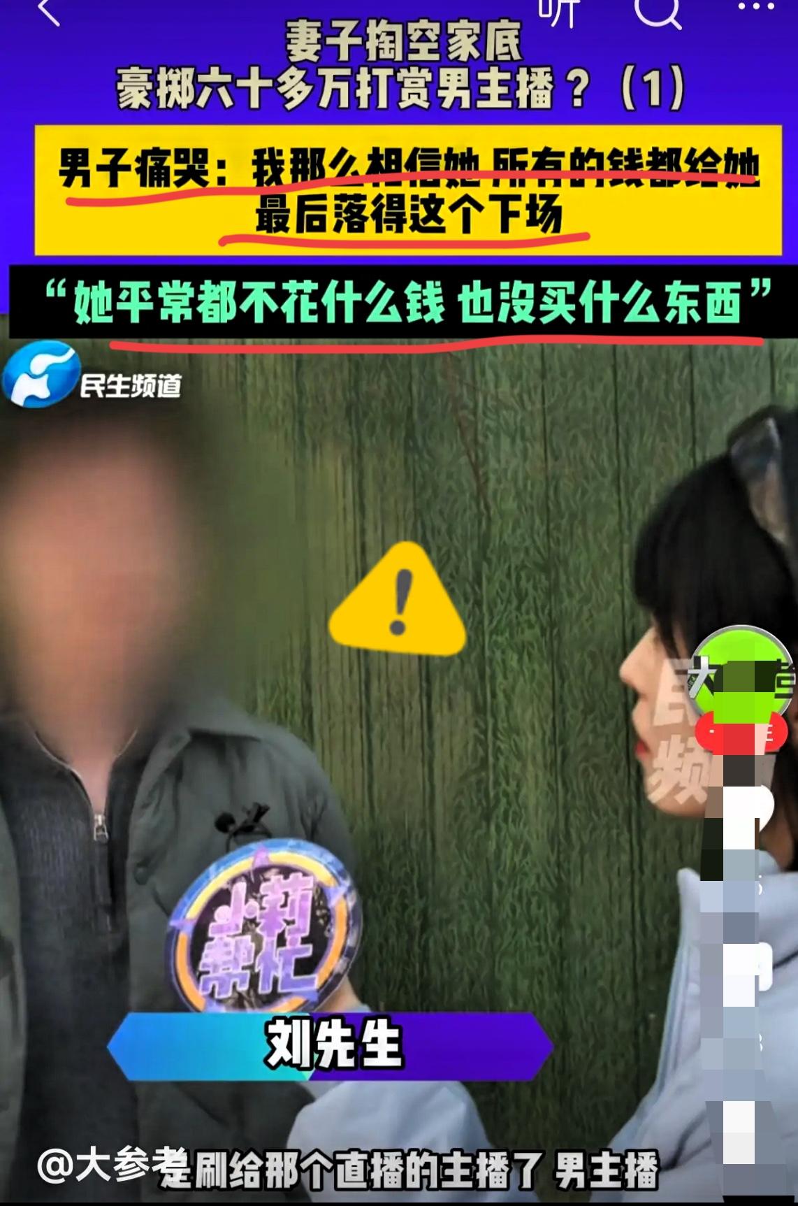 家人们,女子败光116万定期存款这事终于有眉目了!竟不是接济娘家或扶持兄弟姐妹,而是上头打赏男主播了。 刘先生在郑州拼命打拼,把血汗钱116万放心交给妻子存定期,自己却省吃俭用租破房子,就盼妻儿过得好。可前段时间想看存款,妻子遮遮掩掩,最后承认钱全没了,67万打赏给男主播。剩下的钱妻子还说不清楚,刘先生怀疑有私下交易。如今不仅积蓄没了,还欠8万外债。 刘先生又气又无奈,决定先追钱再考虑离婚。咨询律师得知,若能证明不正当关系或低俗诱导打赏,钱有望要回。他正努力收集证据。我觉得,这钱要是能要回来,也算出了口气,大家觉得这钱能要回来不?