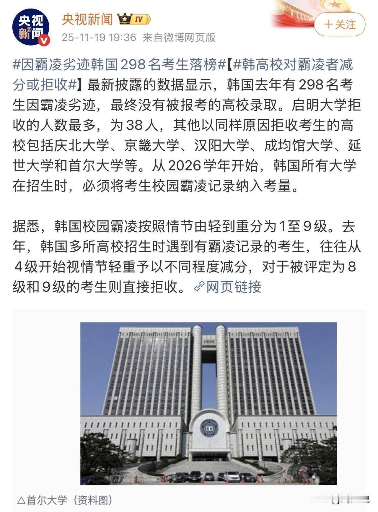 #MCN双量进阶计划#真的罕见!韩国298名考生因有校园霸凌劣迹落榜,启明大学拒收38人居首,首尔大学、延世大学等多所名校均在拒收行列。2026年起所有高校必查霸凌记录,4级减分8级直接拒收! 此事引发网友热议:“就该这样!霸凌者要为过错付出代价,不能让受害者寒心”! 也有网友称:“招生查霸凌记录,能倒逼学生守规矩,净化校园环境”! 还有网友更是坦言:“分级处理合理,既惩戒严重恶行,也给轻度过错者改过空间”。 在周少看来,其实高校将霸凌记录纳入招生考量,是对校园霸凌的明确抵制,既守护了受害者的权益,也传递了“恶行有代价”的导向,能推动校园风气向好,这种对品德的重视值得认可。 客观的说,这种政策值得提倡,当下校园霸凌太严重了,此举可大大保护受害者的权益,更能有效地遏制校园霸凌。 对于韩高校对霸凌者拒收,大家觉得这个举措怎么样?#寻美三湘# #长沙新朋友#
